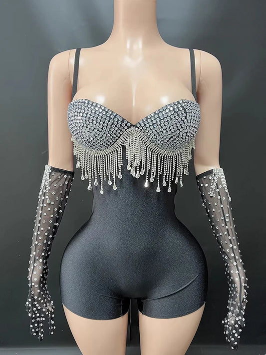 Hot Stamping Sexy Tassel Wrapped Chest Strap Jumpsuit+Gloves New Fashionable Custom Women'S Clothing