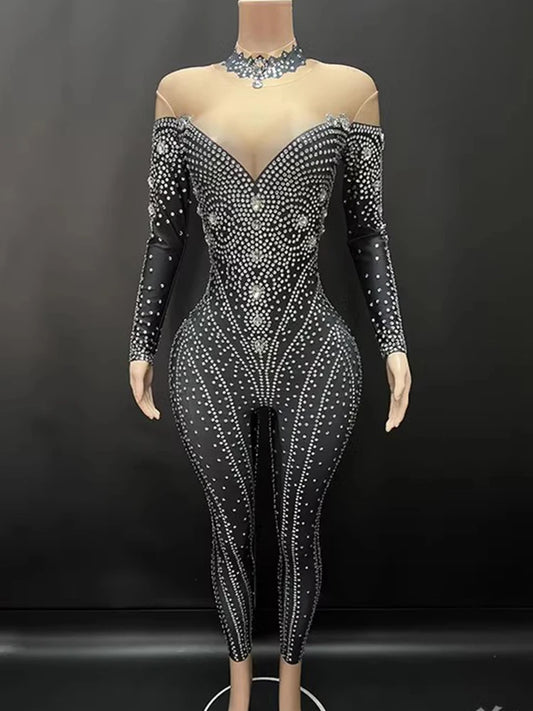 Sexy Women Black See Through Mesh Bodysuit Sparkly Rhinestone Mirrors Tight Fitting Catsuit Club Party Event Show Wear