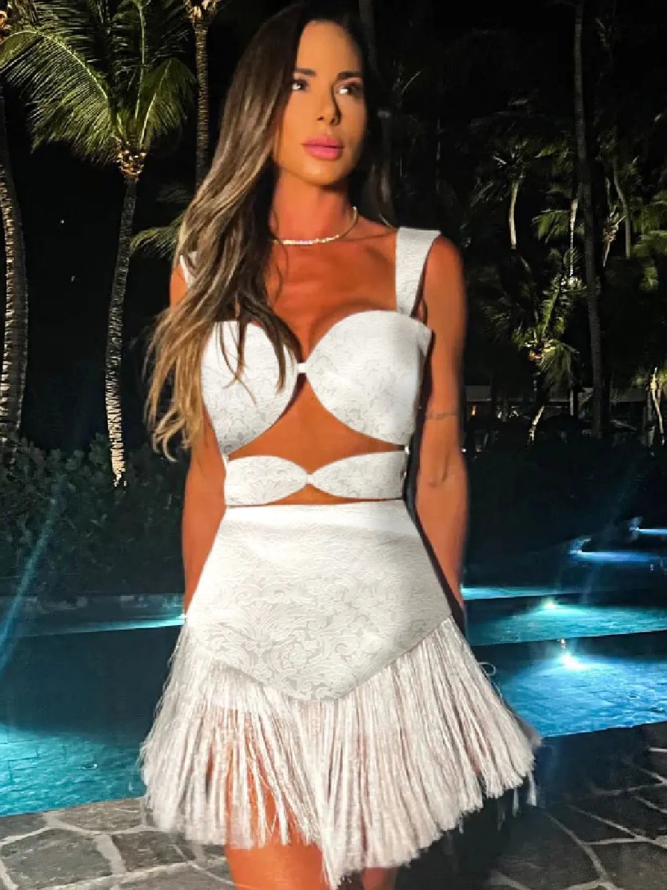 Cet été, affichez votre style avec cette robe mini-jupe découpée tendance. Dotée de bretelles à pampilles élégantes et d'une silhouette flatteuse, cette robe blanche est parfaite pour les soirées, les vacances et toutes les occasions spéciales. Chic et accrocheuse, elle est un incontournable de la garde-robe de toute femme à la mode.