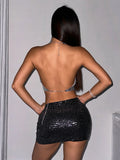 Sexy Sequin Spicy Girl Top with Personalized Splicing and Hanging Neck Vest