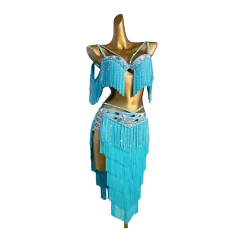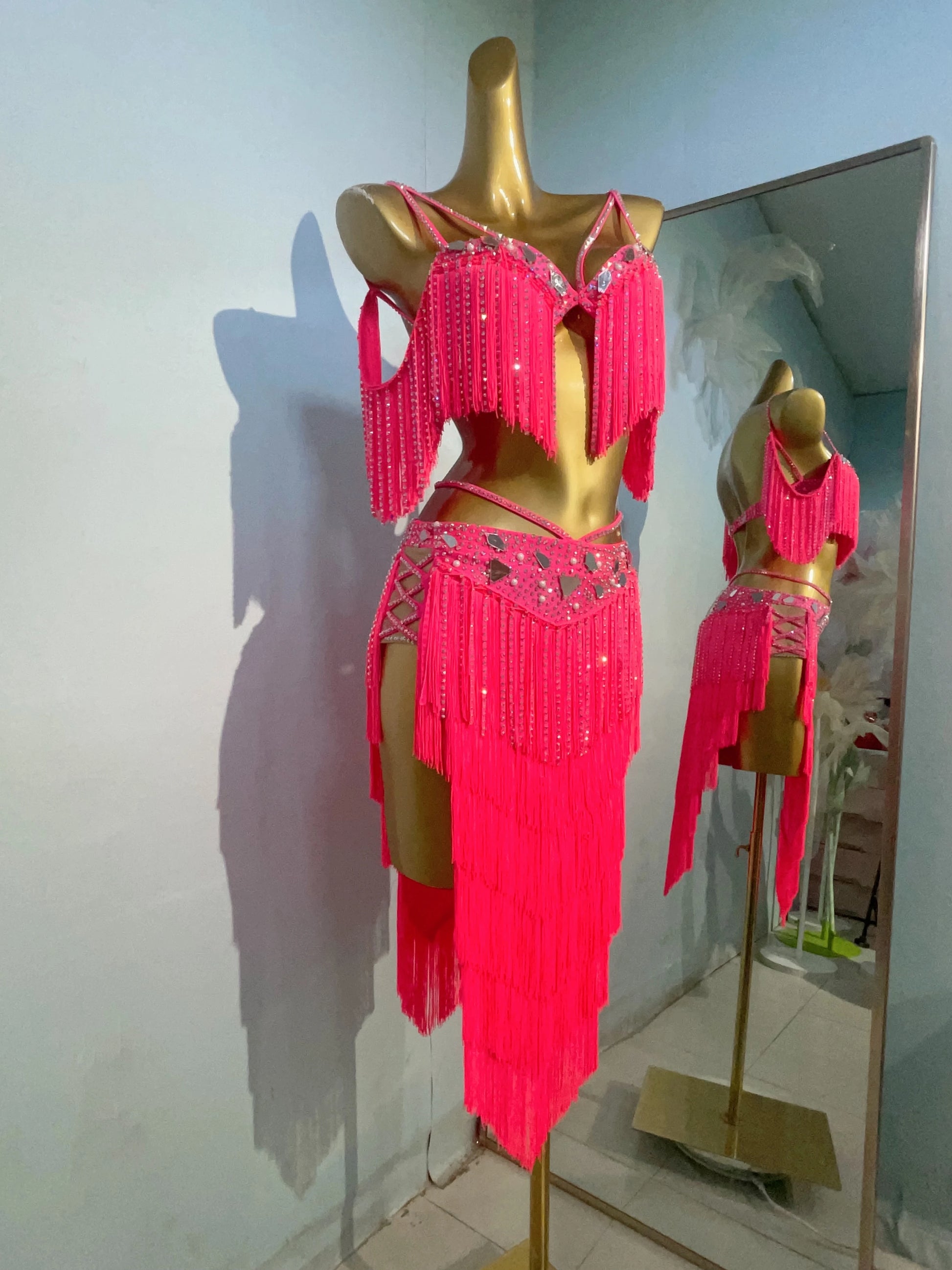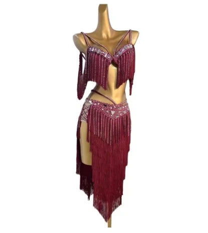 A high‑end, made‑to‑measure belly/Latin fusion competition dress designed for Cha/Samba performance. Features multi‑layer tassels for dramatic motion, layered “lenses” (appliqué panels) for visual depth, and strategic rhinestone embellishment to maximize stage sparkle while preserving dancer mobility and comfort.