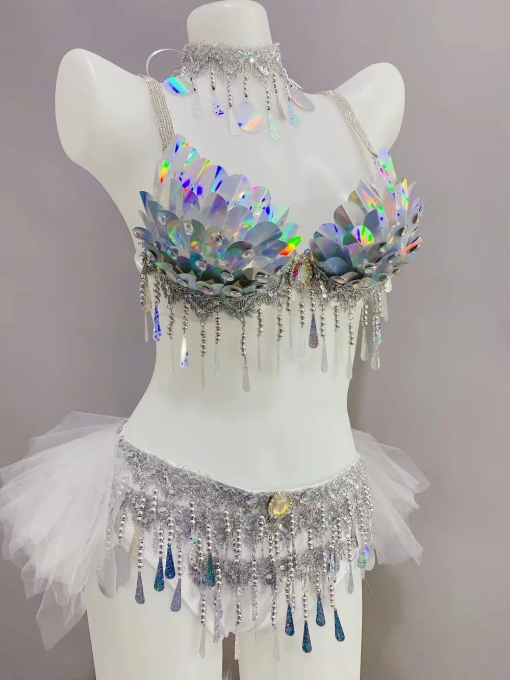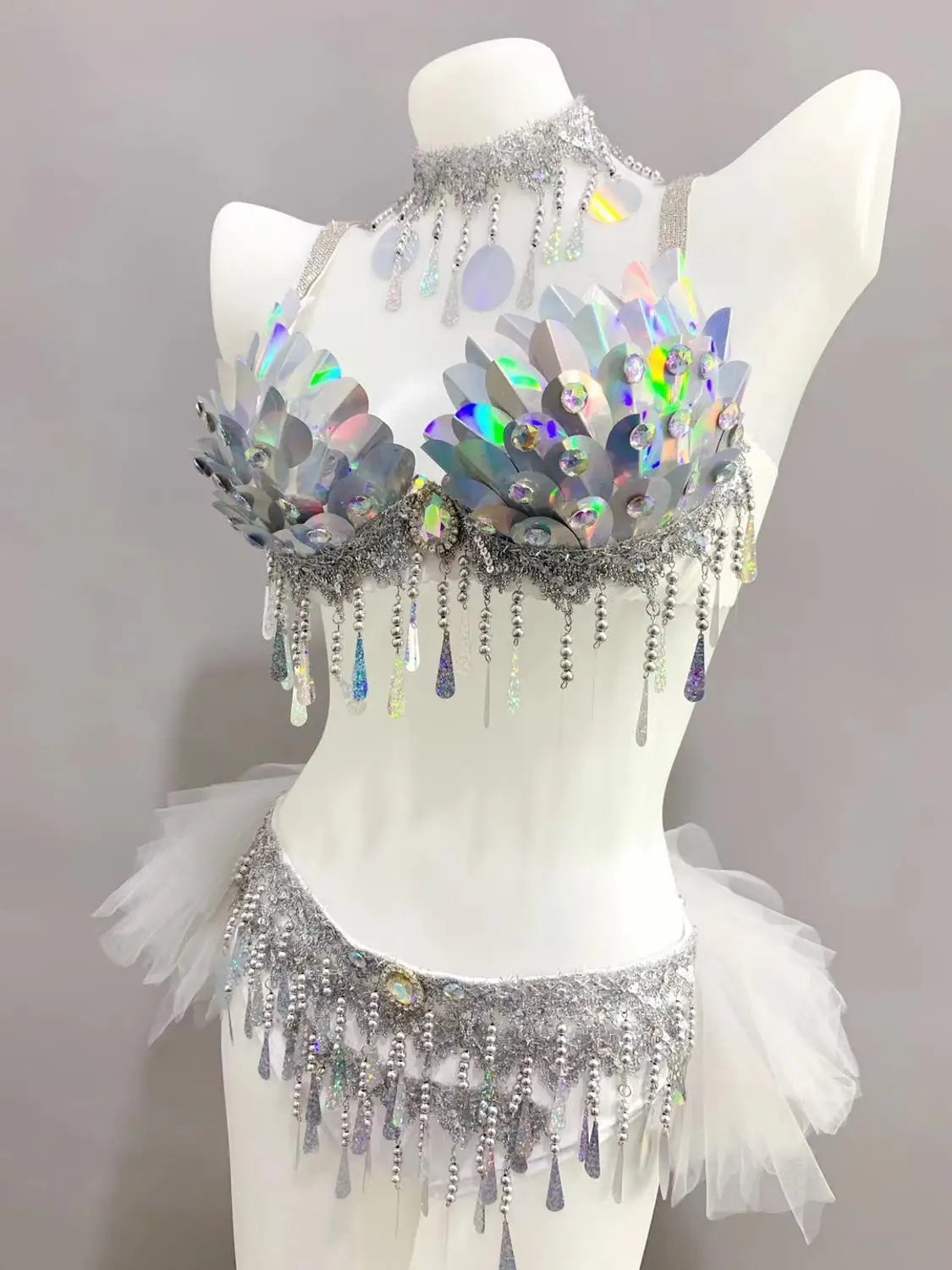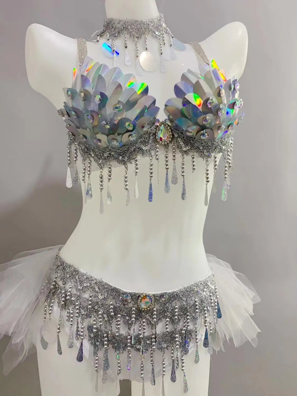 Ensemble de danse du ventre pour danseuse, compétition, performance sur scène, paillettes argentées, bikini, tenue de rave, boîte de nuit, bar, fête