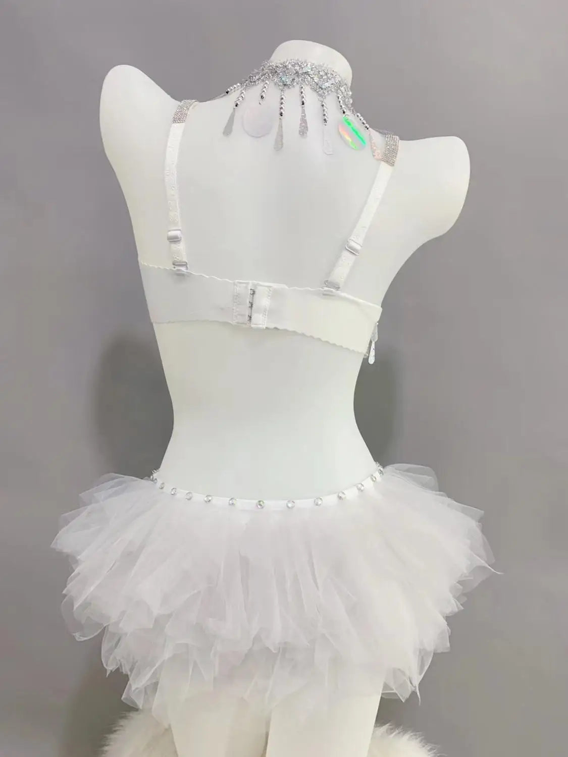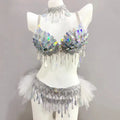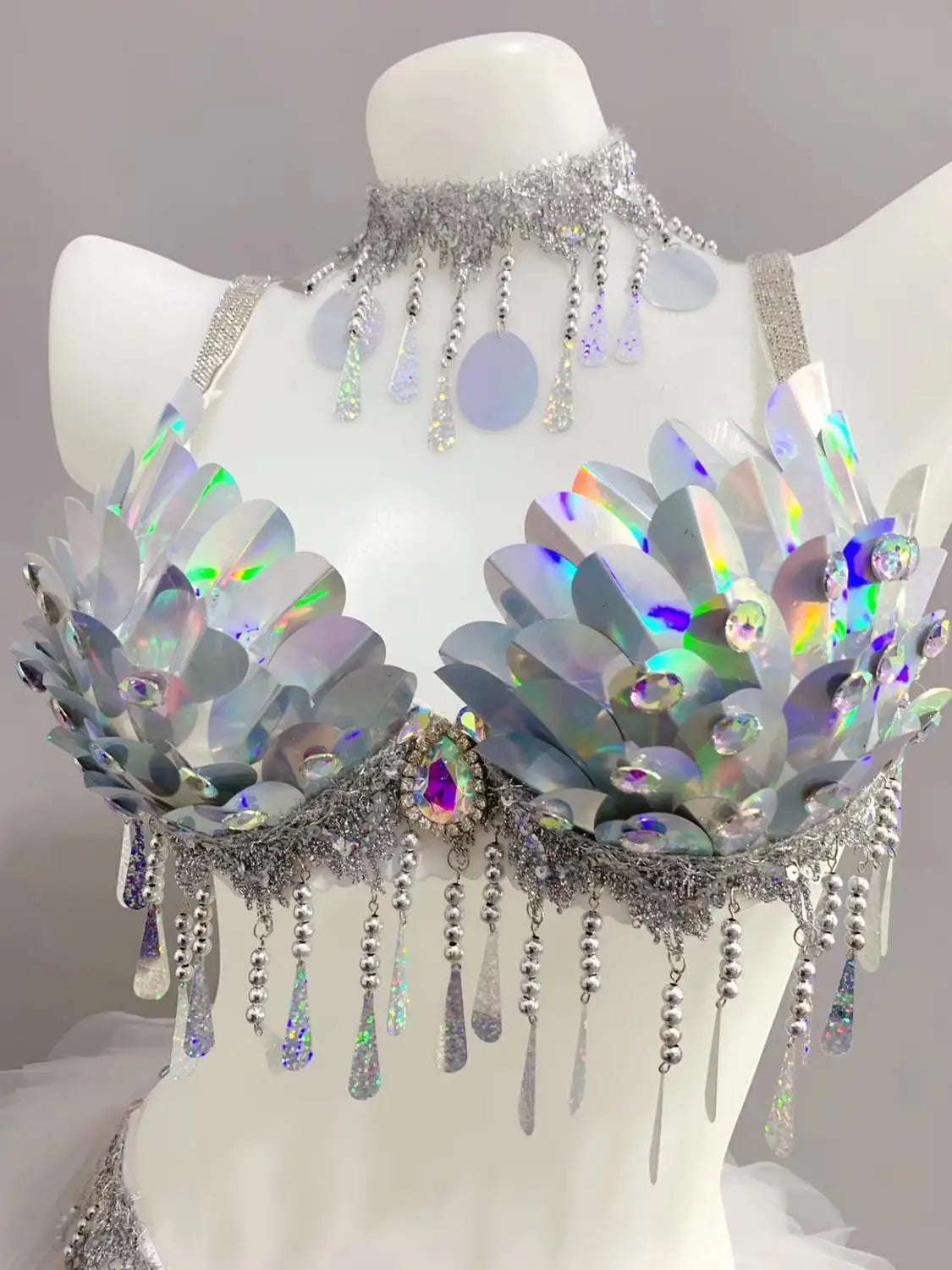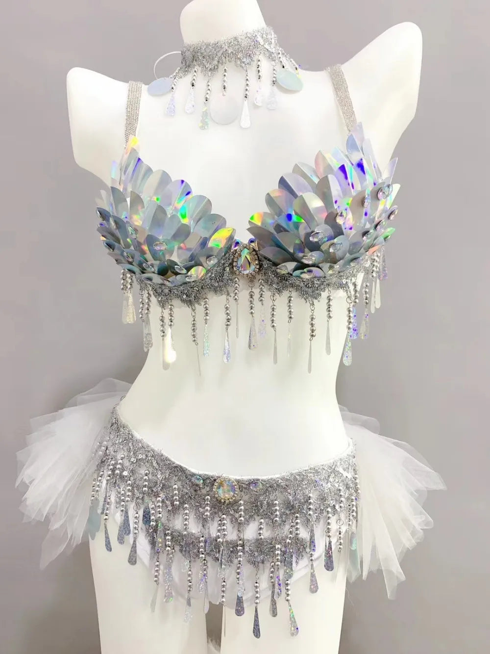 Ensemble de danse du ventre pour danseuse, compétition, performance sur scène, paillettes argentées, bikini, tenue de rave, boîte de nuit, bar, fête