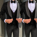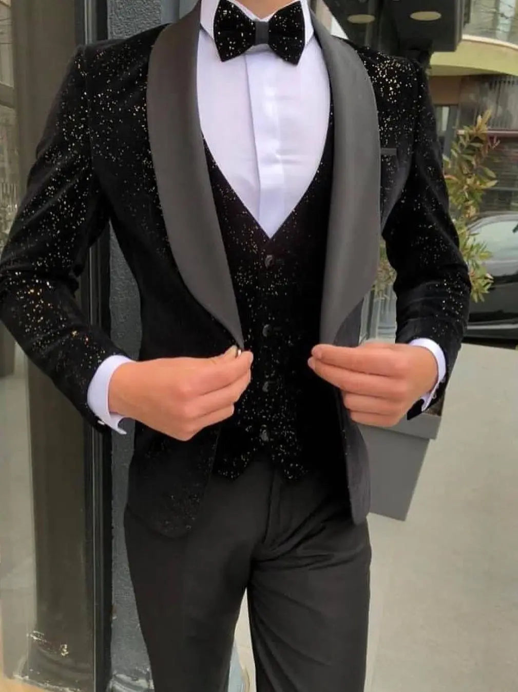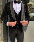 Shine on your big day or any special occasion with this black sequined men’s wedding tuxedo, designed in a modern slim fit. This three-piece set includes a glittering blazer, matching vest, and tailored pants, making it ideal for grooms, proms, parties, or even upscale business events. Exude confidence and sophistication with every step in this glamorous yet refined ensemble, crafted for those who love to stand out.