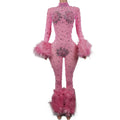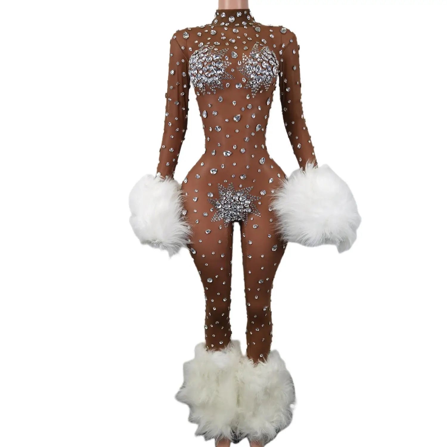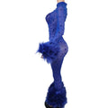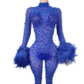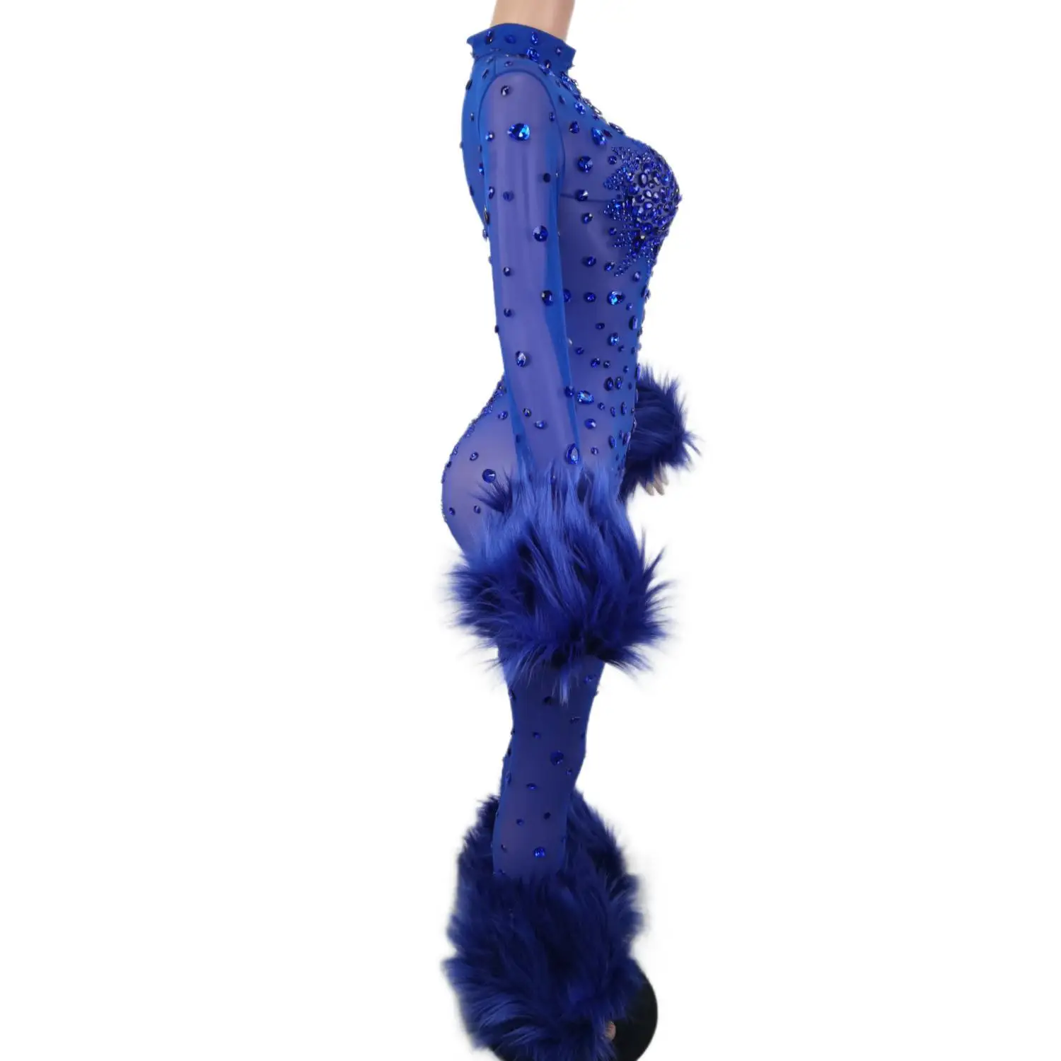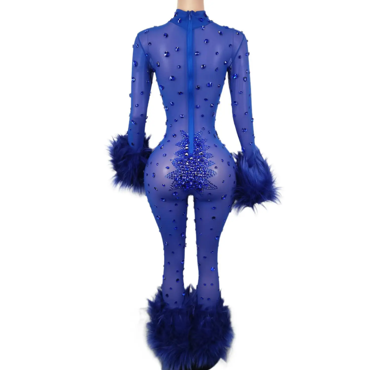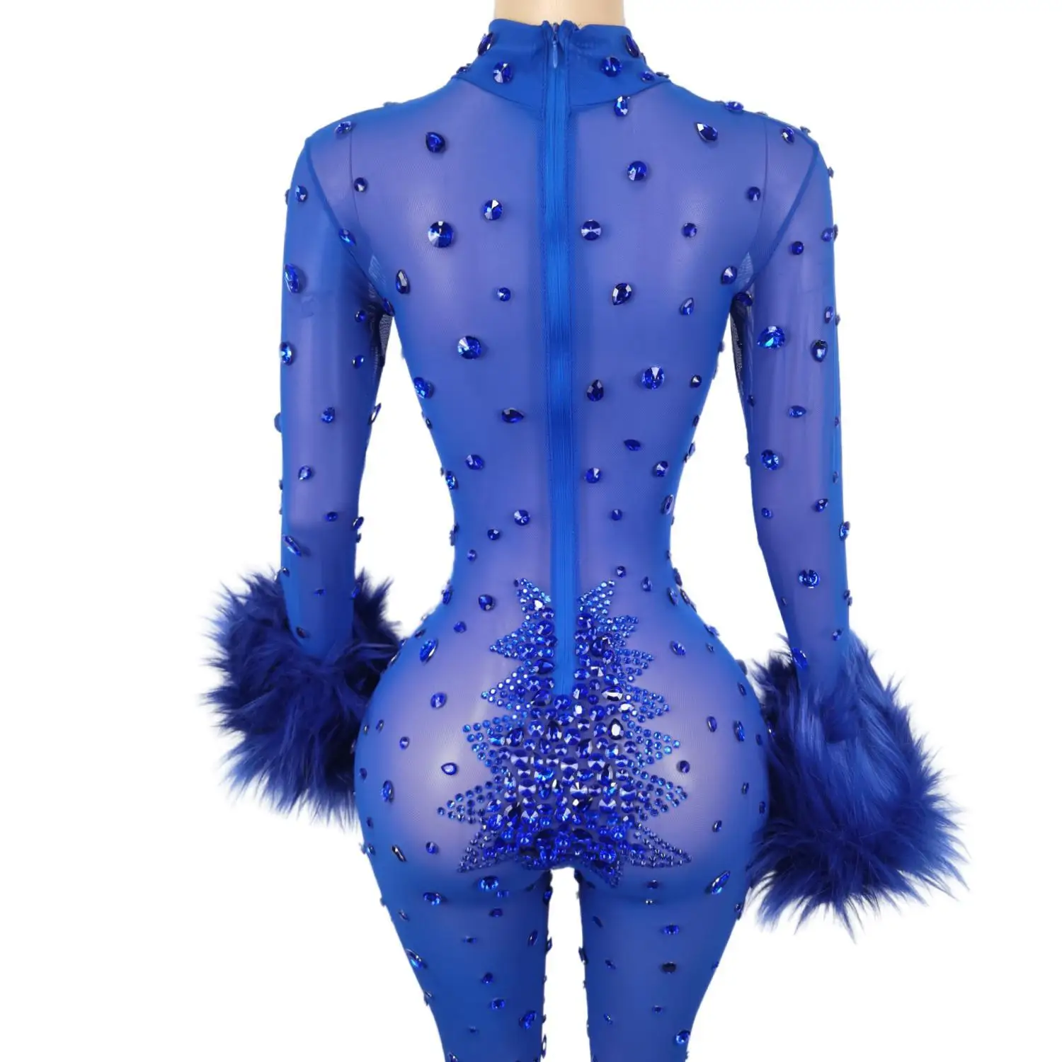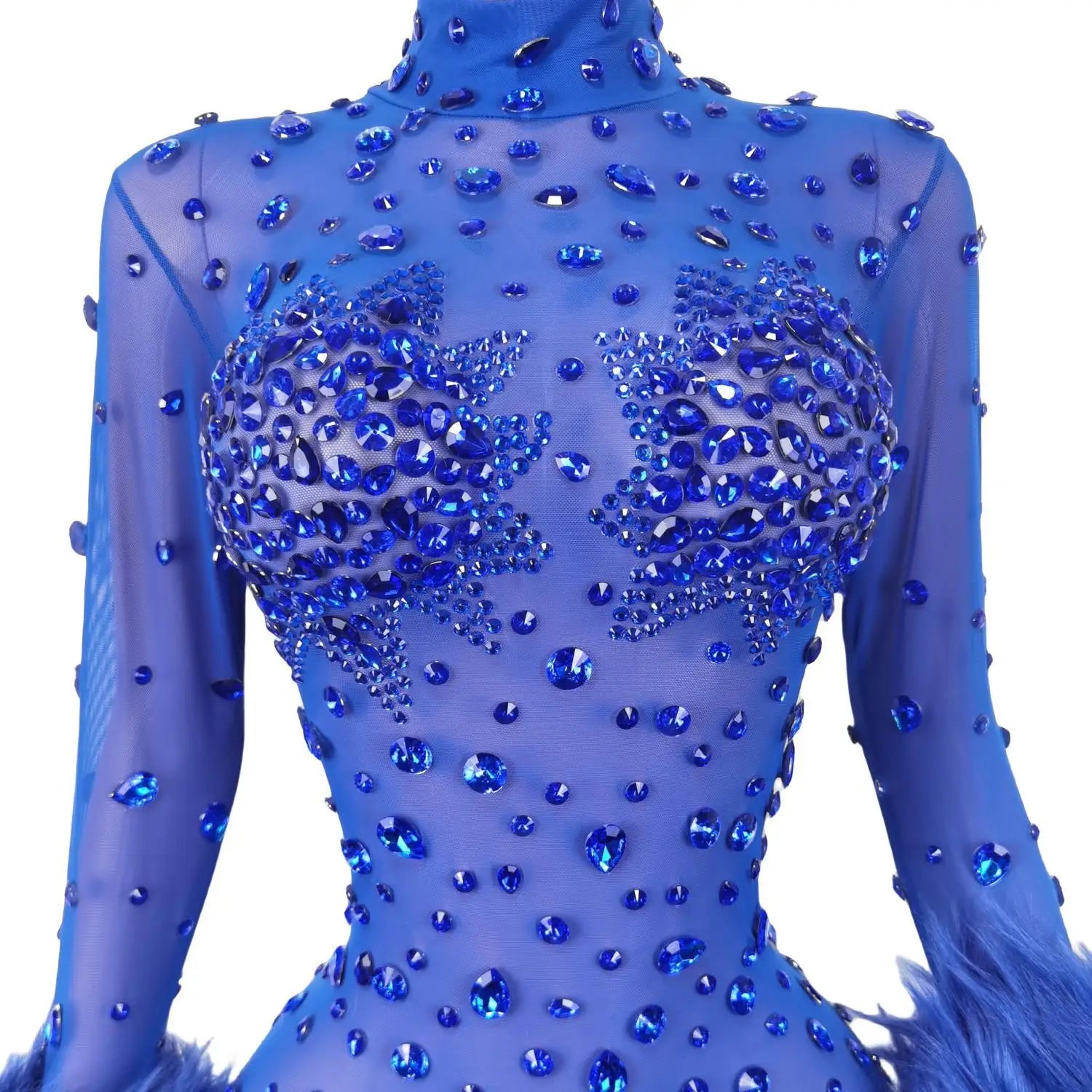 Superbe combinaison transparente en fourrure bleue ornée de strass pour danseurs et artistes - Costume de scène slim à manches longues