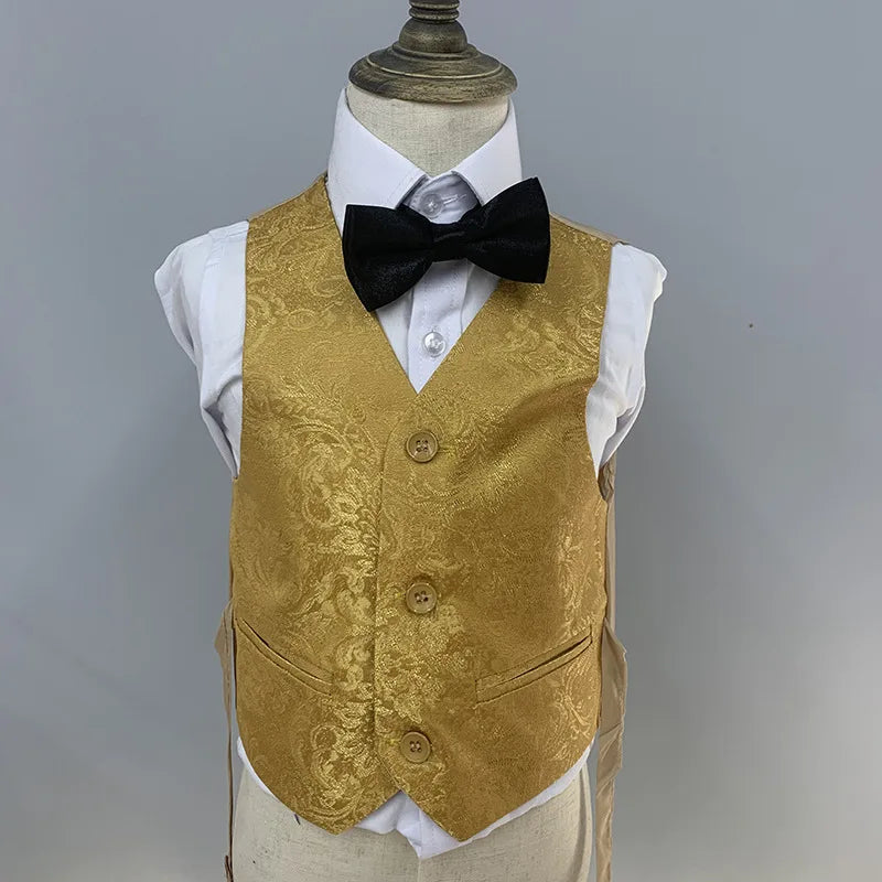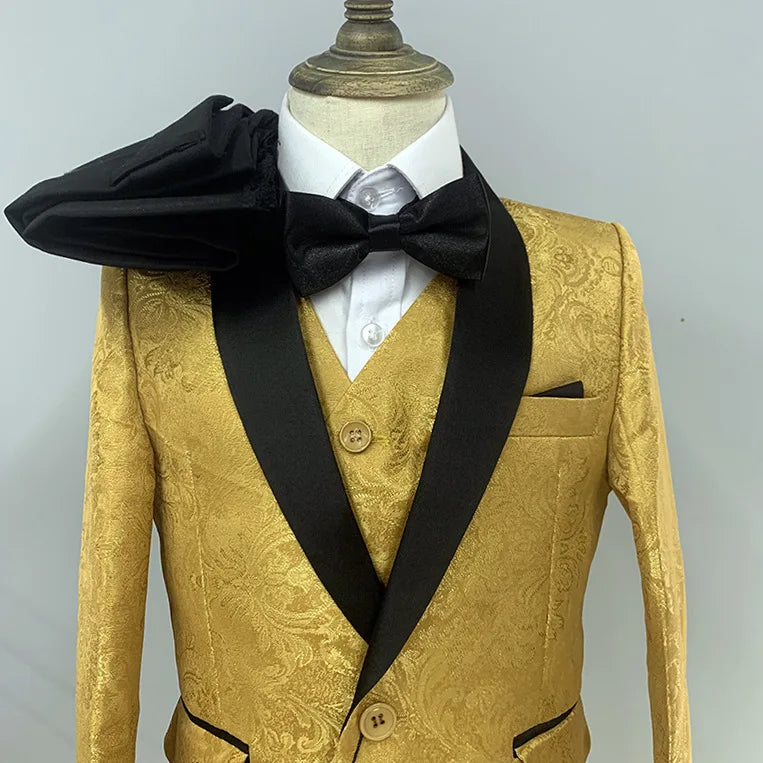 Sublimez le style de votre enfant avec cet élégant costume 4 pièces pour garçon, parfait pour les mariages, les dîners et les occasions spéciales. L'ensemble comprend une élégante veste dorée, un gilet assorti, un pantalon ajusté et un charmant nœud papillon, pour une allure élégante en toute occasion. Idéal pour les photos de mariage et les réceptions officielles, ce blazer allie sophistication et confort, un incontournable de la garde-robe de votre enfant.
