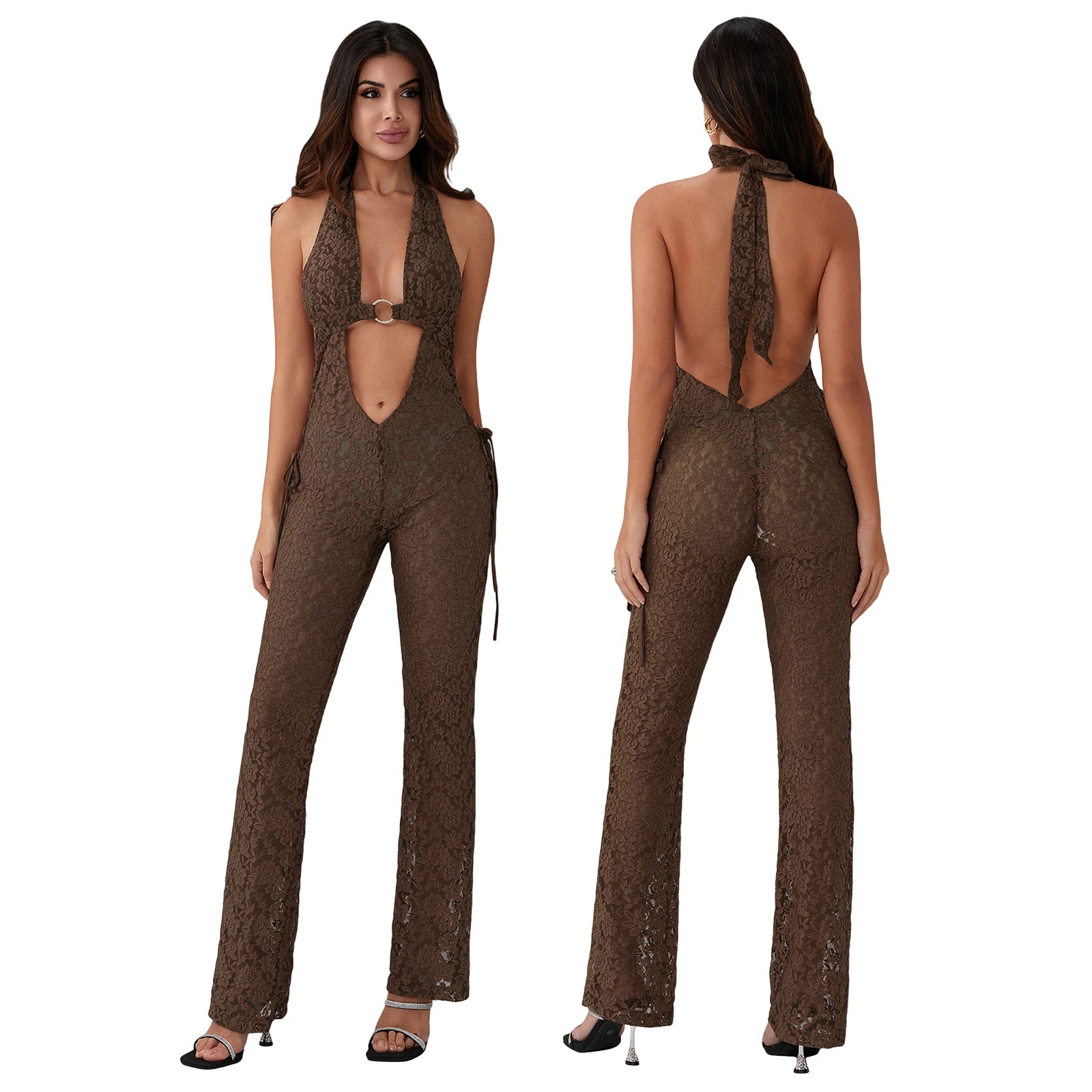 Womens Y2K Summer Lace-up Halter Deep V-Neck Backless Tight Jumpsuit Sleeveless Side Tied Hole Slim Fit Flare Rompers