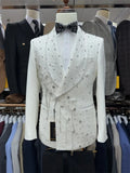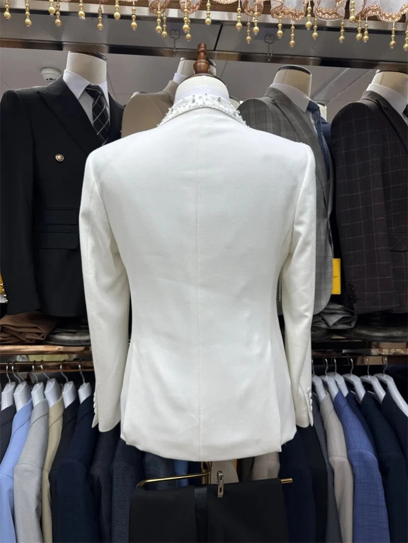 Make a striking first impression with this expertly tailored Crystals Beading White Men Suit Set — a two-piece ensemble that blends classic monochrome elegance with contemporary, eye-catching detail. The sharp white blazer is crafted from a premium, structured fabric that holds its silhouette while offering a comfortable, breathable wear suitable for long ceremonies, receptions, or important office events. Its clean lines and slim, modern cut ensure a flattering fit across the shoulders and torso, while precision tailoring delivers a polished, professional look.