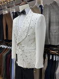 Crystals Beading White Men Suit Set 2 Piece Blazer+Black Pant Trousers Customized Formal Office Jacket Groom Wedding Tuxedo Coat