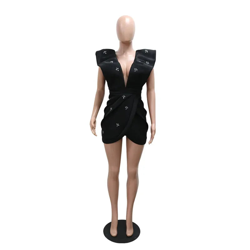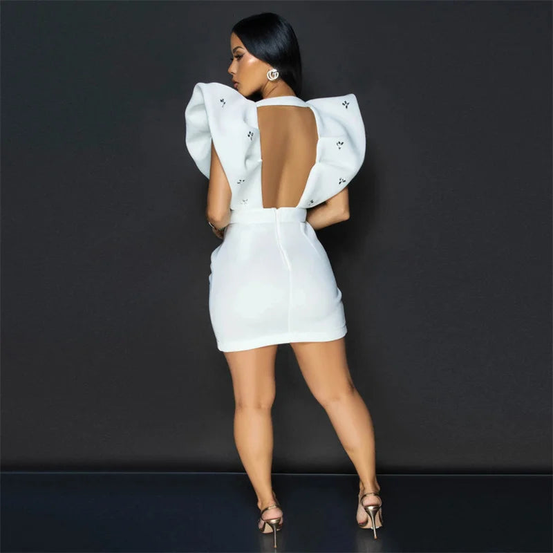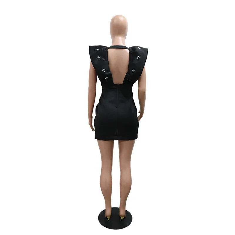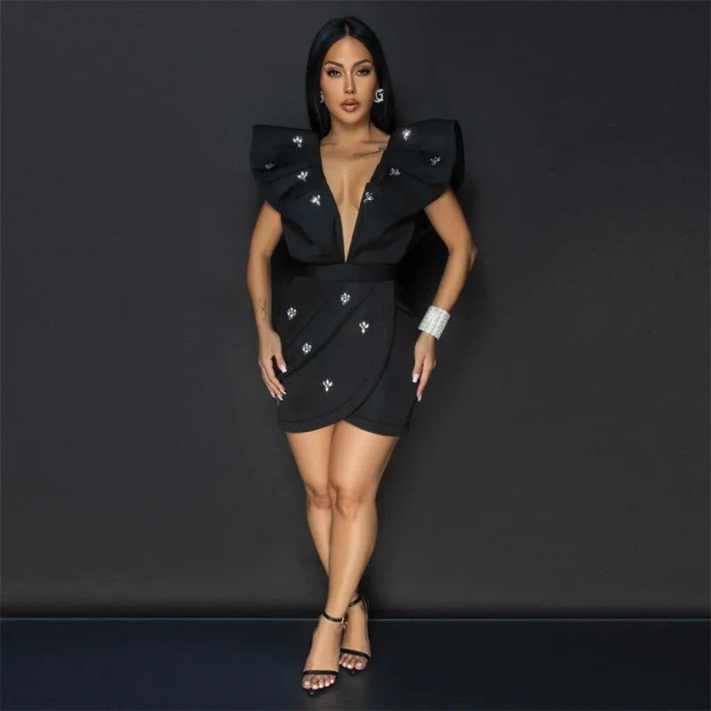 Robe de soirée moulante sexy à décolleté en V profond et dos ouvert avec strass pour femme, manches volantées, froncée, irrégulière, mini, boîte de nuit, noire et blanche