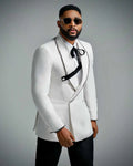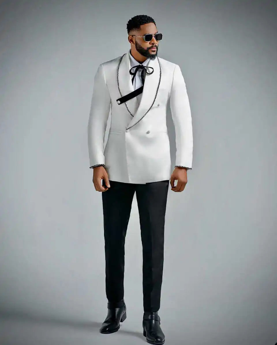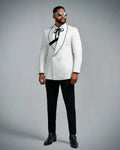 Make a striking entrance on your wedding day or at any black-tie event with this Designer Beaded Wedding Suit for the modern groom. Expertly tailored as a two-piece ensemble, the jacket and trousers are crafted to combine classic tuxedo elegance with contemporary, statement-making detail. The jacket features a smooth, luxurious shawl lapel that frames the face and neck with refined simplicity, while hand-applied beadwork traces the contours of the lapel and shoulders to add subtle sparkle and textural depth. For grooms who appreciate a bold silhouette, the double-breasted front lends structured sophistication and a flattering, tapered fit that accentuates the waist.