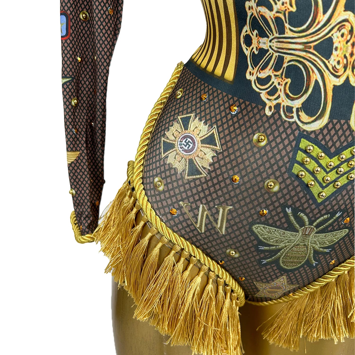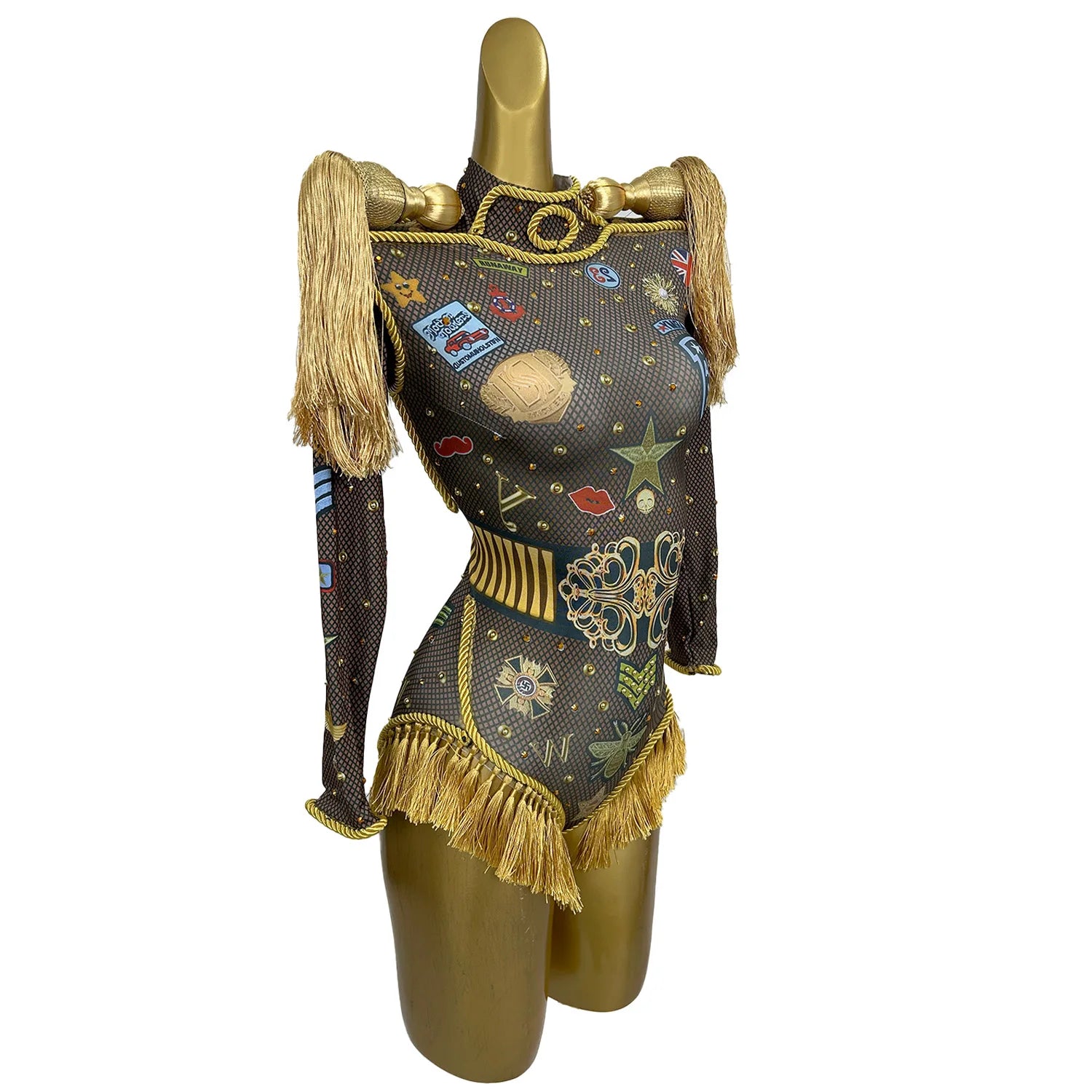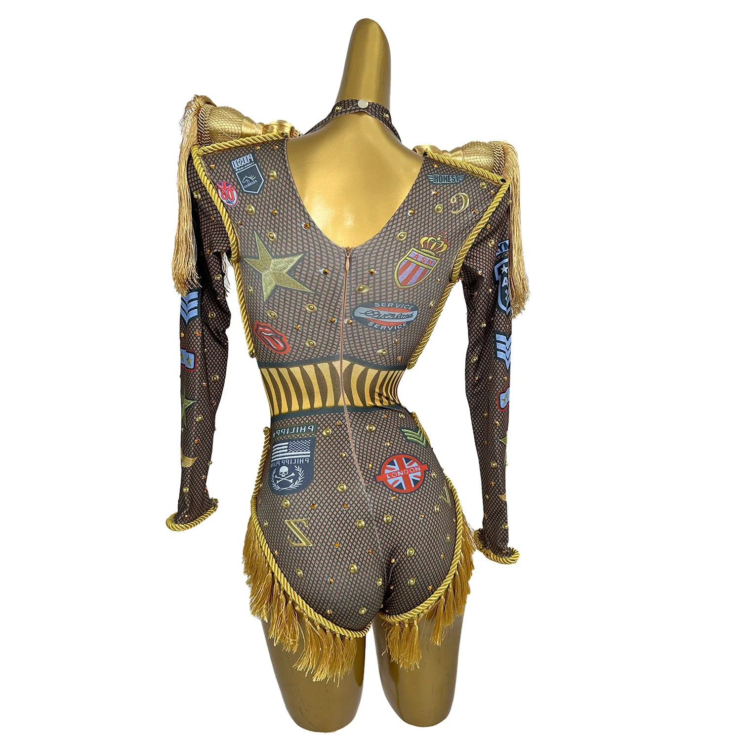 Tassel Epaulettes Rhinestones Stage Leotard Women Showgirl Stage Performance Wear Club Dance Bodysuit