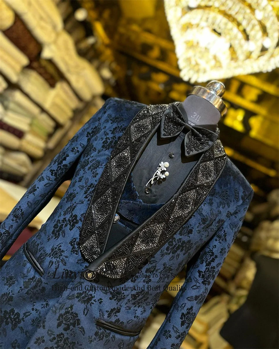 Ensemble smoking homme bleu élégant et luxueux, brodé de fleurs, avec revers châle – Idéal pour les mariages, les fêtes et les bals de fin d'année