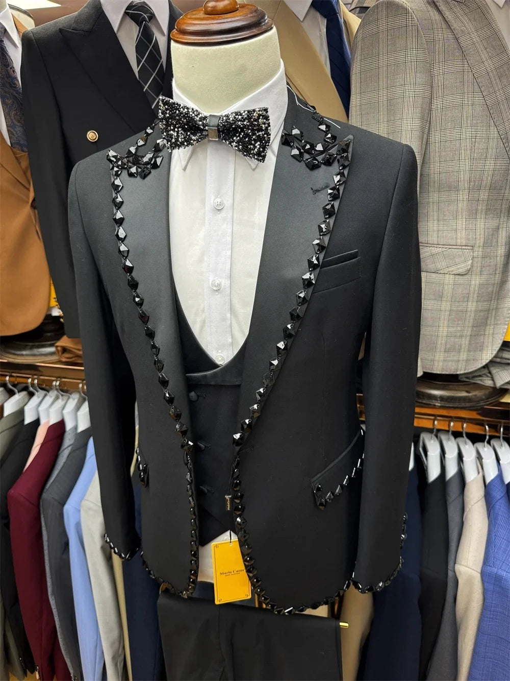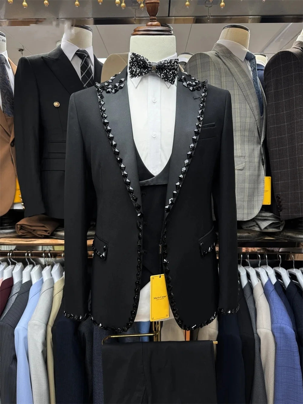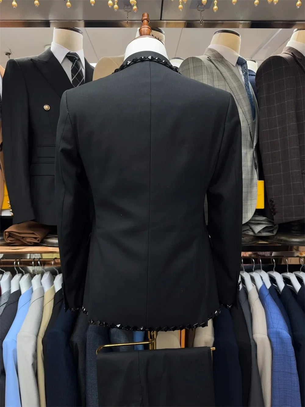 Turn heads with this luxurious, tailor‑made 2‑piece suit designed for grooms, red‑carpet moments, stage performances, and any occasion that calls for glamour. This double‑breasted blazer features a beaded, rhinestone‑encrusted shawl lapel and elegant tassel detail — all customizable to your exact measurements and style preferences.
