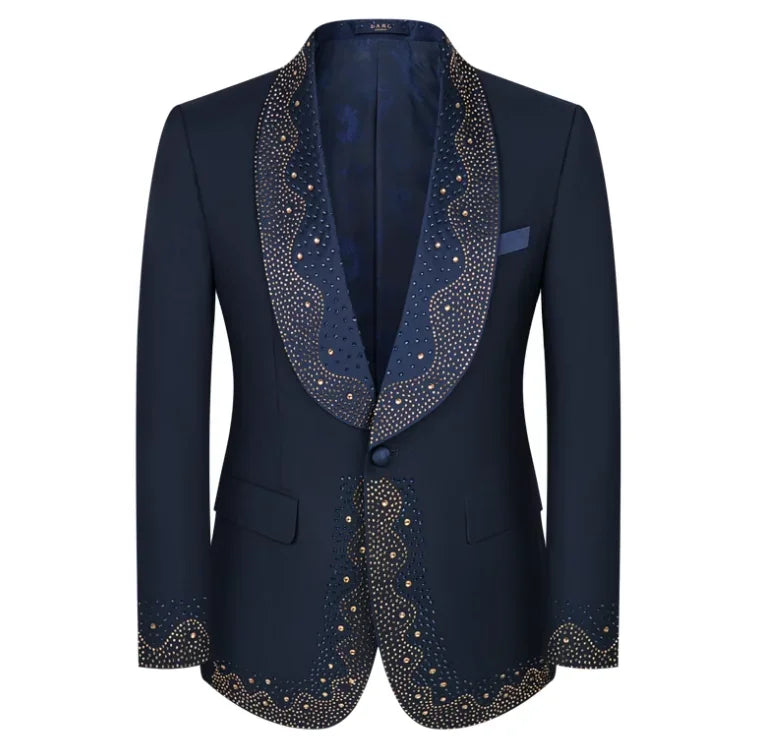 This Elegant Men’s Beaded Suit combines classic tuxedo lines with artisanal beading for subtle sparkle and texture. The made‑to‑measure construction ensures a flawless silhouette while bead embellishments are applied with reinforced settings for longevity—perfect for weddings, receptions, red‑carpet events, and evening parties