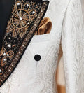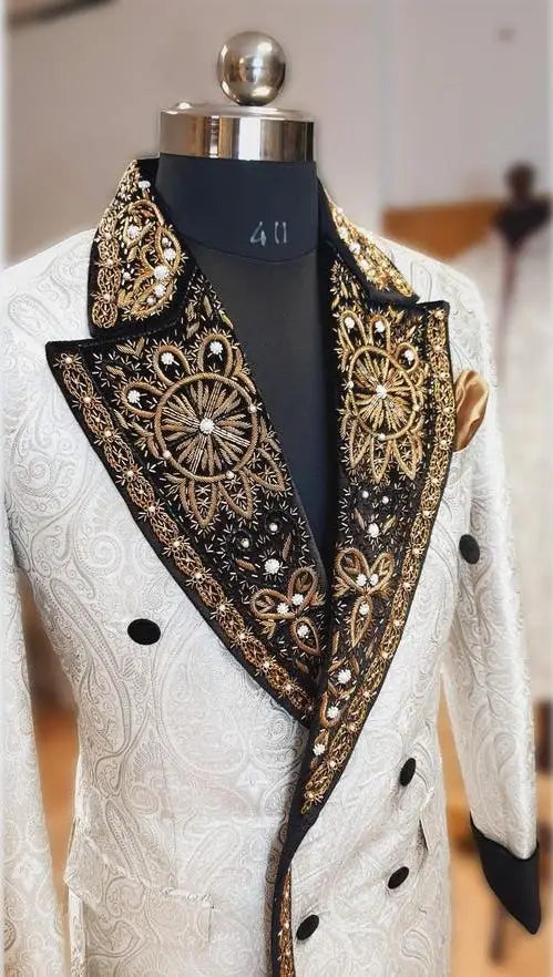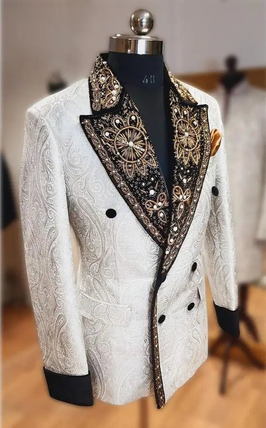 Command attention with this Fashion Appliques Men’s Jacket — a single-piece, tailor-made double-breasted blazer crafted from rich jacquard fabric and embellished with elegant embroidery and appliqués. Designed for the modern groom, event host, or any gentleman who prefers a standout outerpiece without the weight of a full suit, this jacket blends artisanal detail with precision tailoring to create a distinctive statement garment.