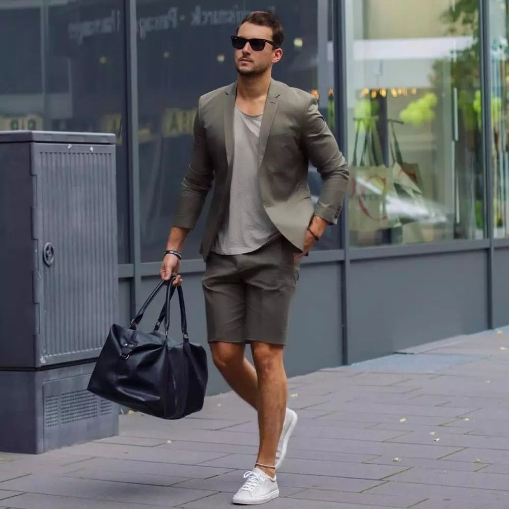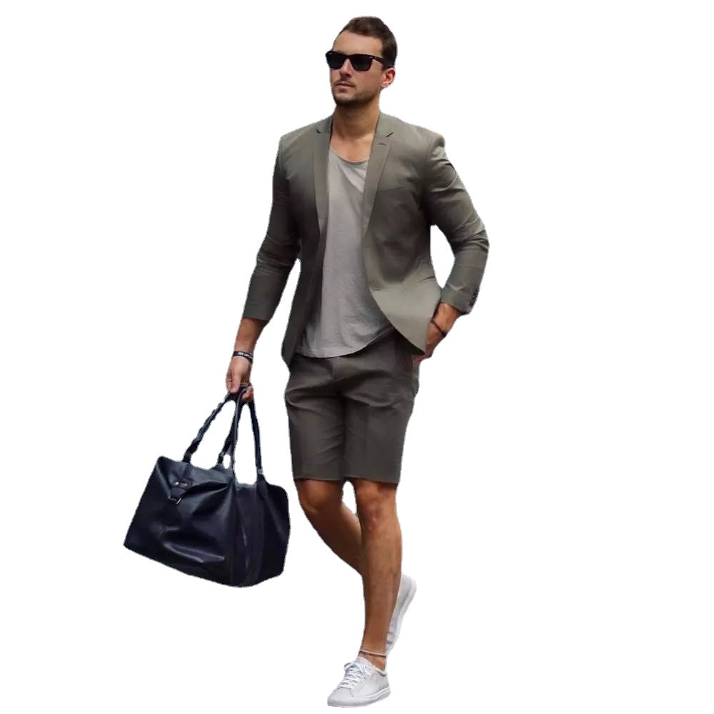 Costume gris pour homme avec pantalon court, smoking de marié, revers crantés, coupe slim, 2 pièces (veste + pantalon)