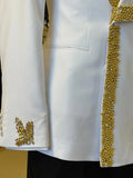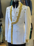 Make a powerful, refined statement with this fashion-forward, tailor-made 2-piece men’s suit designed for grooms, red-carpet appearances, high-end events, and anyone who wants couture-level detailing. This bespoke set includes a double-breasted blazer—richly embellished with hand-sewn beading and precision-set crystals—and a pair of perfectly tailored black trousers. Crafted to your exact measurements, the ensemble delivers an impeccable fit and a dramatic, elegant silhouette.
