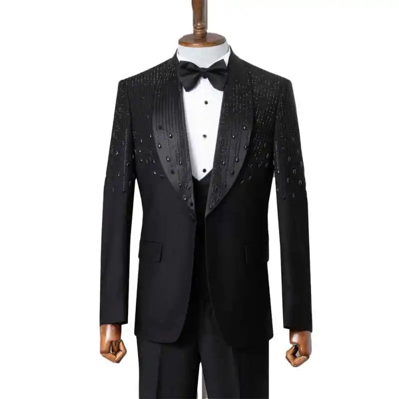 Elevate your wedding-day look with the Formal Beaded Wedding Tuxedos 3 Piece Set — a refined, trim-fit ensemble that combines contemporary tailoring with handcrafted beadwork for a polished, fashion-forward appearance. This luxurious three-piece set includes a single-breasted jacket, a coordinating vest, and tailored trousers, all designed to create a cohesive, photogenic silhouette ideal for grooms, groomsmen, and distinguished guests.
