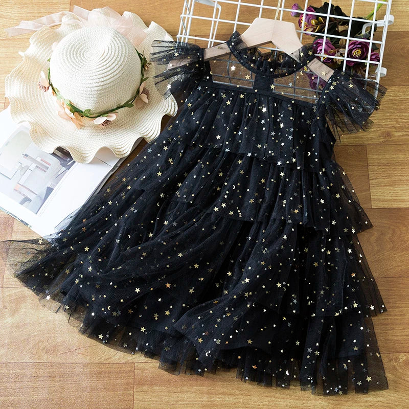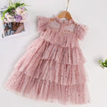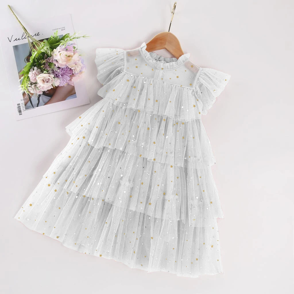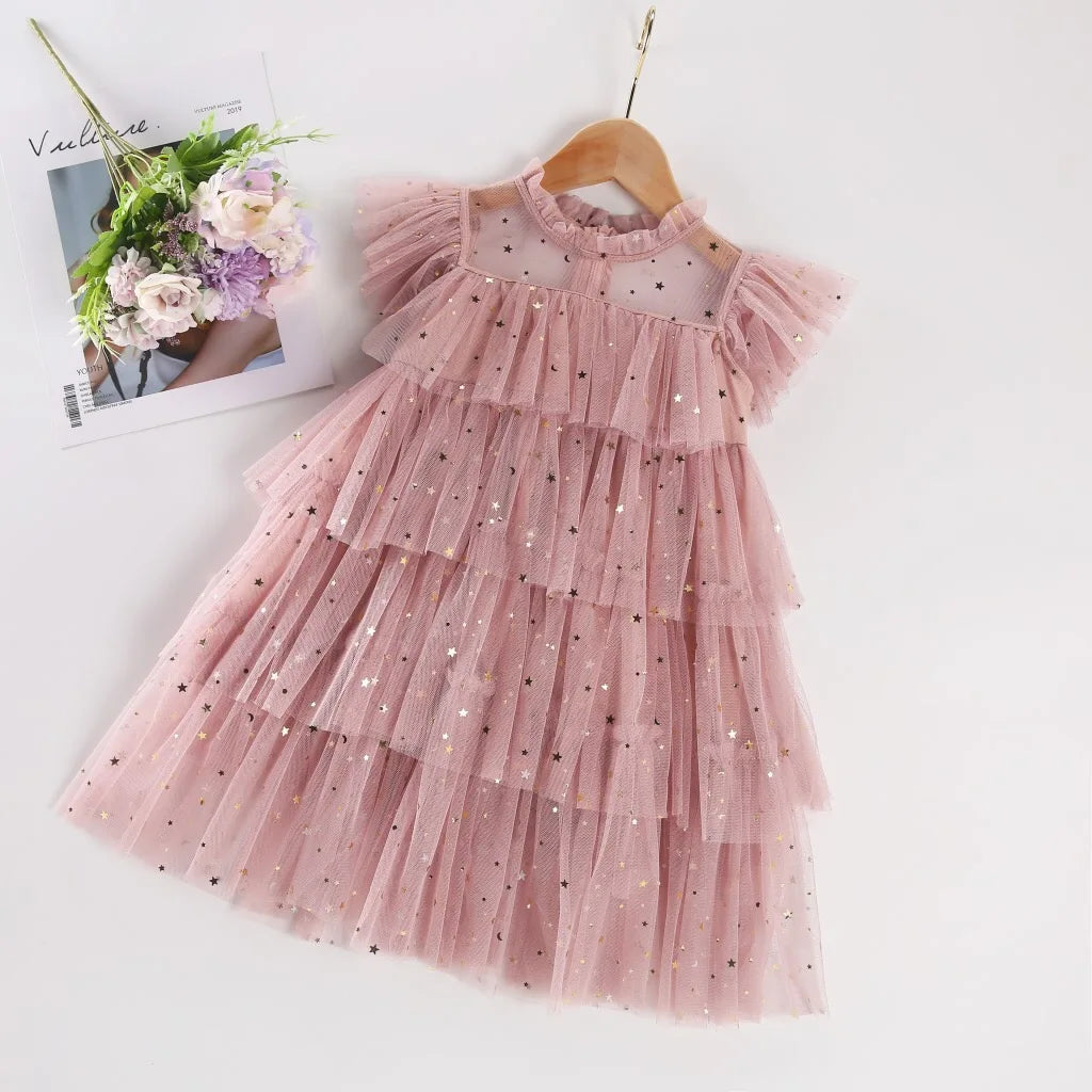 Robe rose en tulle superposé pour petite fille, avec paillettes étoilées et manches à volants