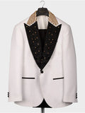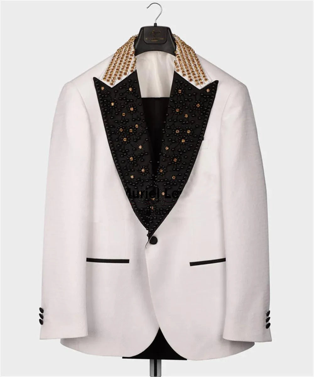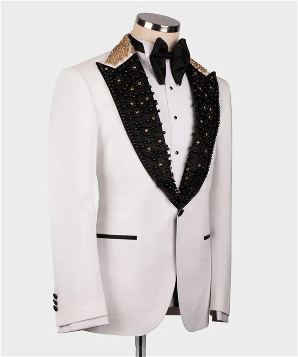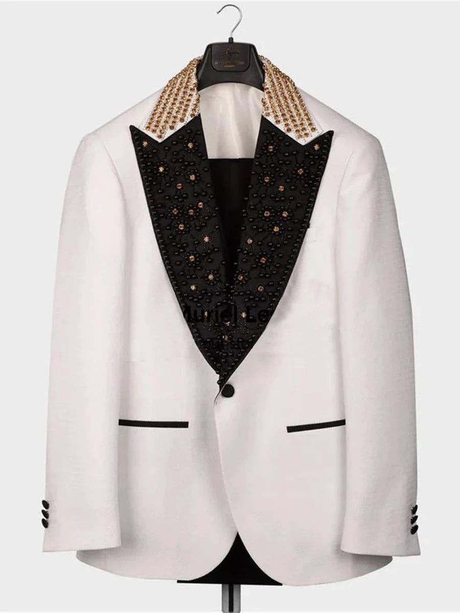 Smoking blanc de luxe fait main avec revers pointus noirs et veste ornée, costume 2 pièces élégant pour mariages et événements formels