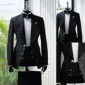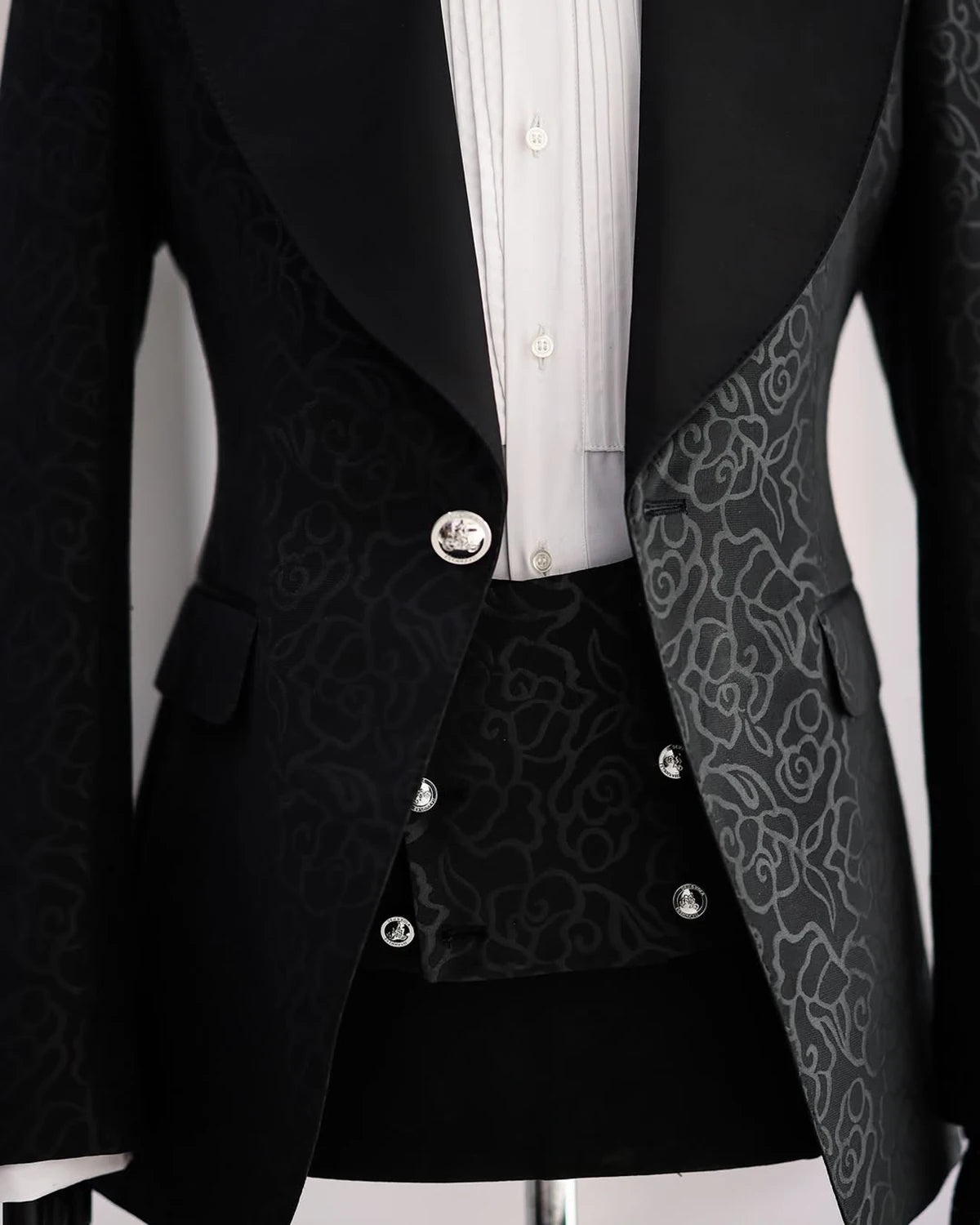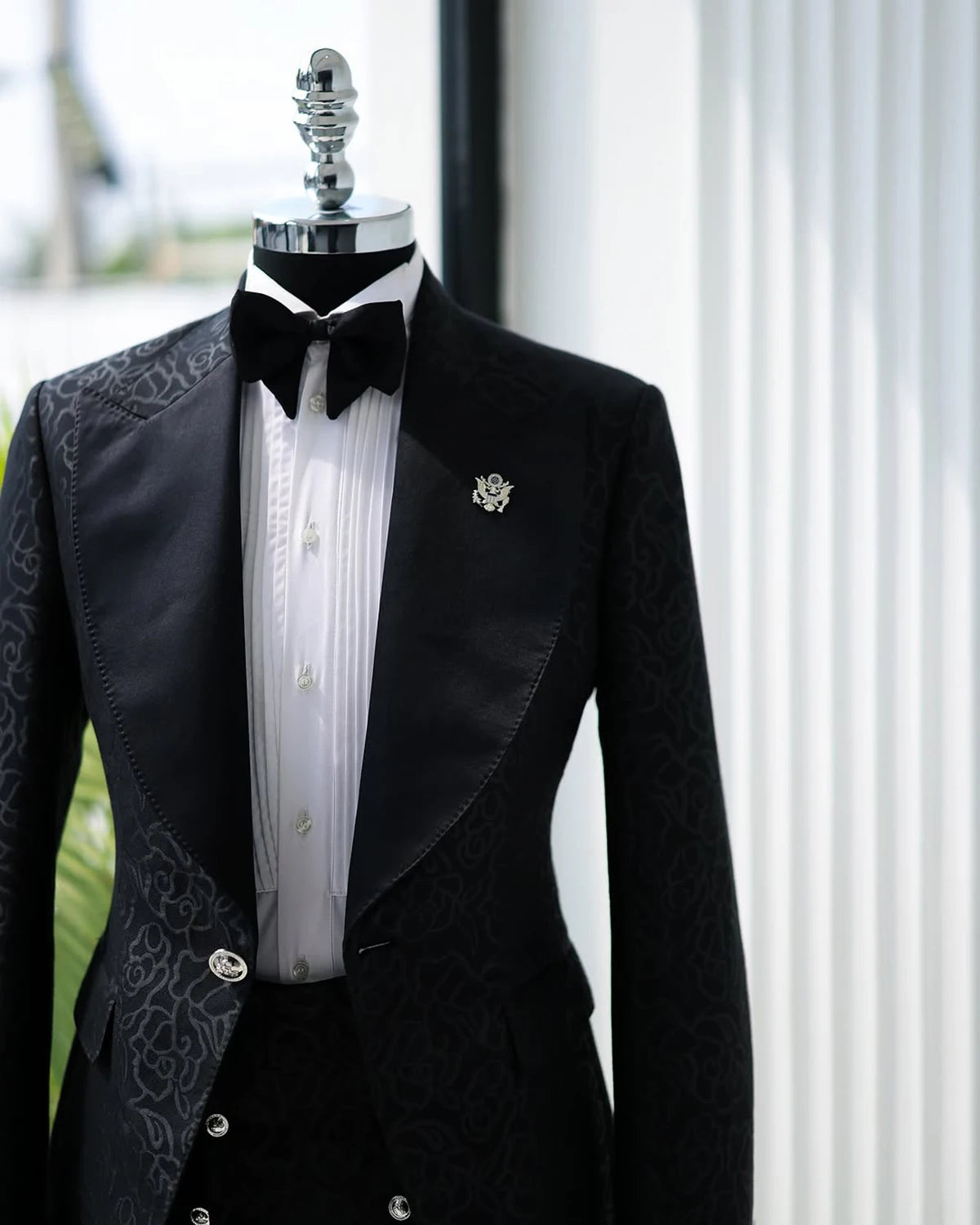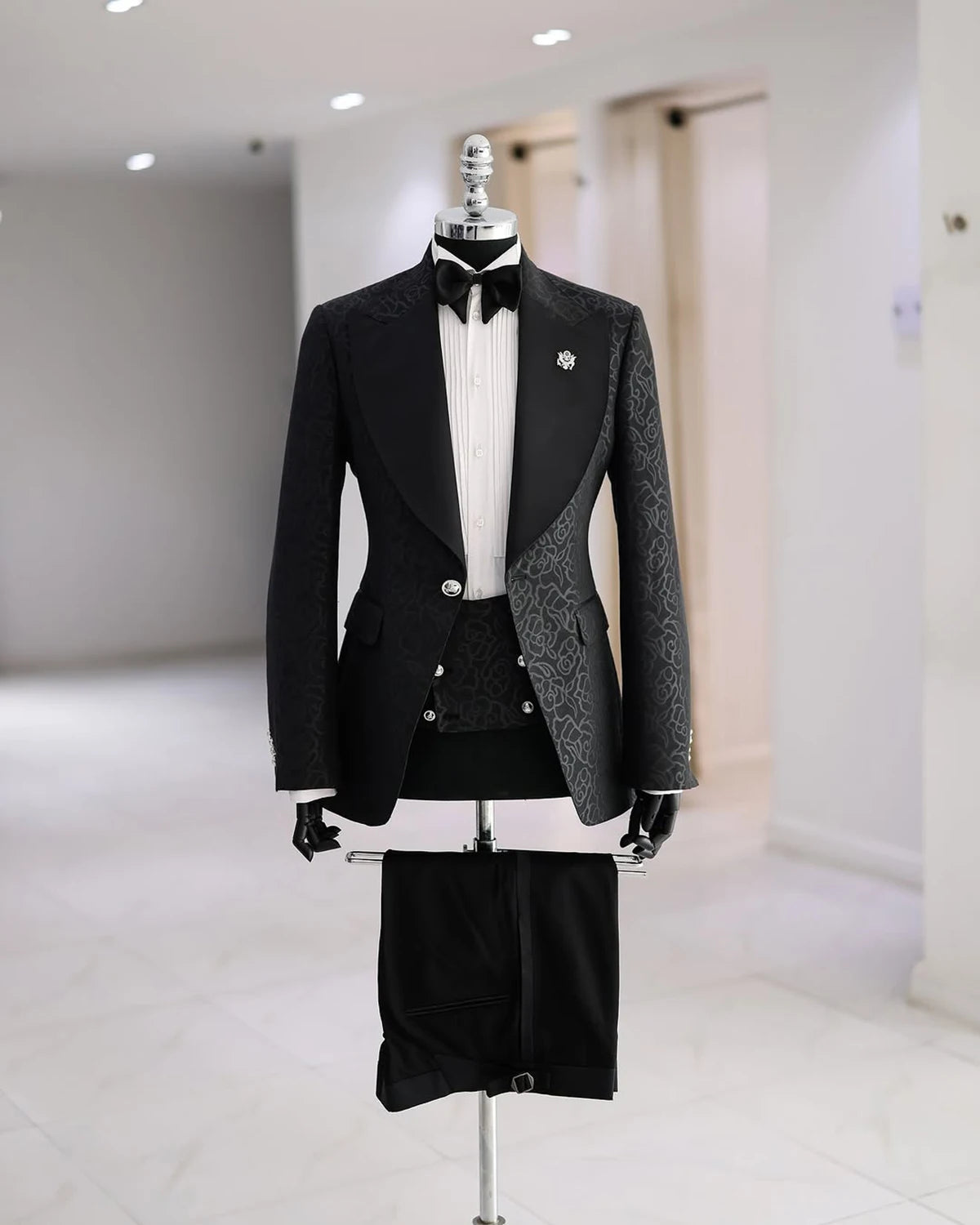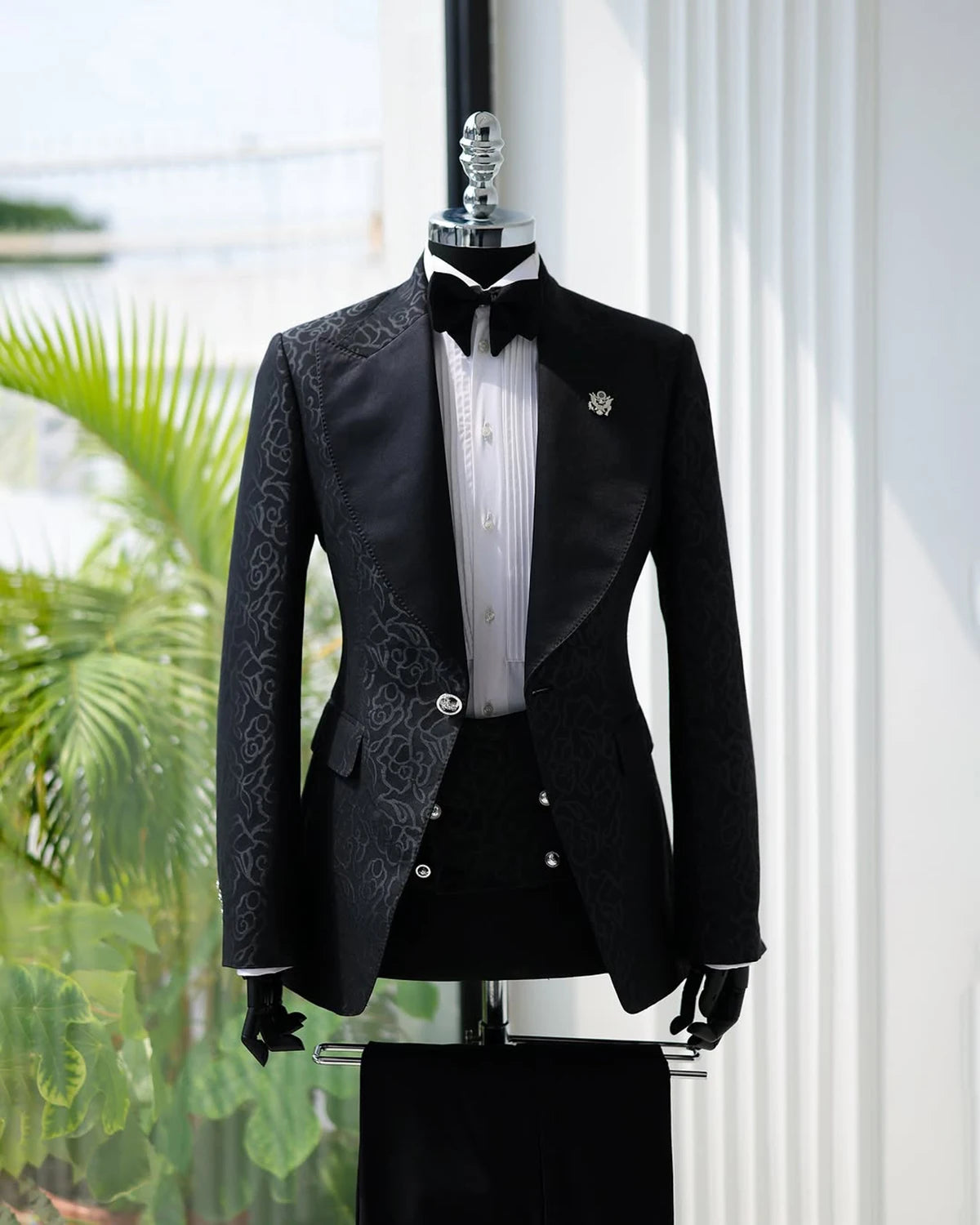 A refined, made‑to‑measure two‑piece suit designed for grooms and formal occasions. Features a one‑button jacquard blazer with a sculpted peaked lapel paired with matching tailored pants. Focuses on elegant texture, clean lines, and personalized fit.