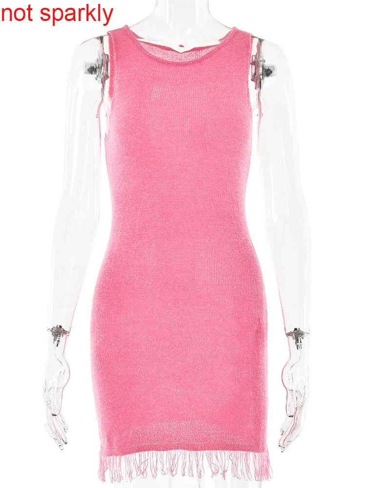 Knit Sexy See Through Tassel Women Dress Pink Sleeveless Round Neck Dress Summer Skinny Elegant Party Beachwear