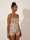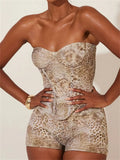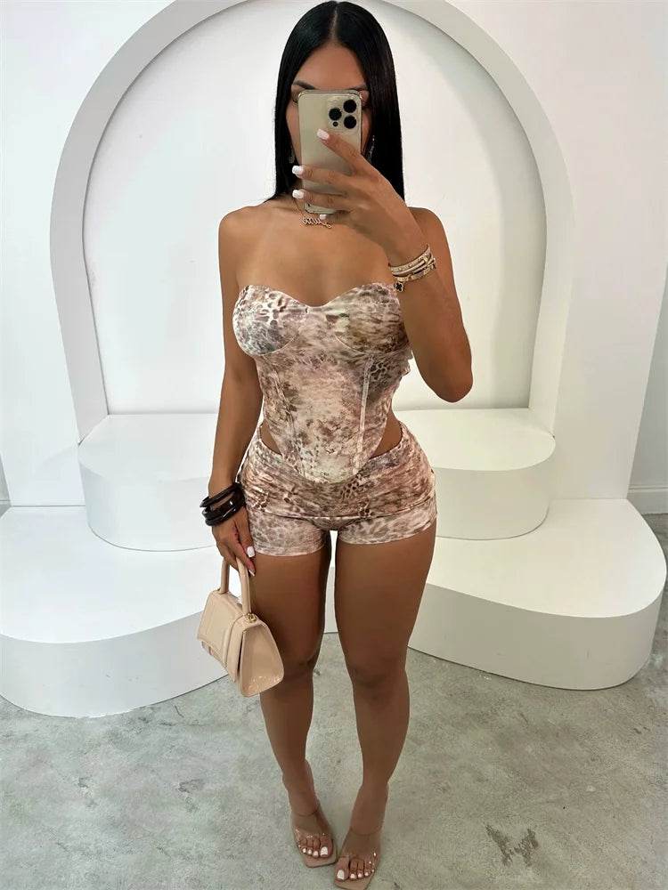 Animals Print Matching 2 Piece Set Women Summer New Strapless Crop Tanks+Stacked Skinny Shorts Female Hipster Streetwear