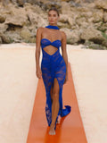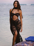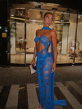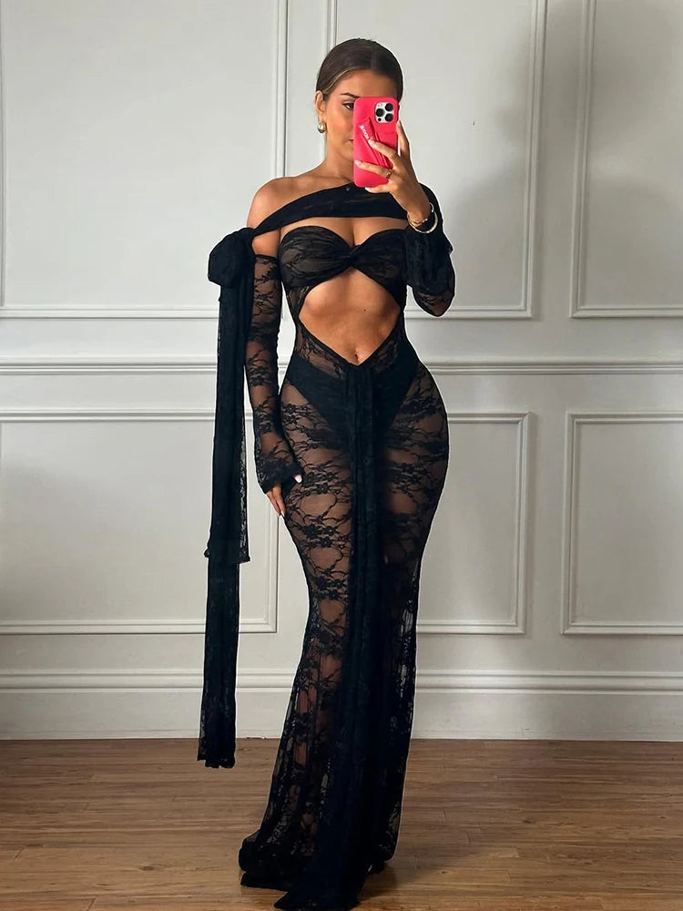 Strapless Hollow Women Dress Sexy Lace Transparent Shirring Split Sheath Long Robe +Scarf Coquette Mujer Midnight Vestidos