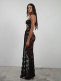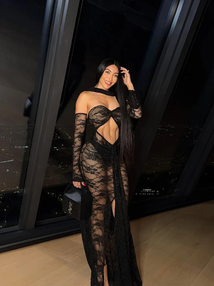Make an unforgettable impression in this sexy strapless women’s dress, featuring delicate lace, sheer transparent panels, and elegant shirring for a body-skimming silhouette. The sheath-style long robe includes a stylish split for added drama, complemented by a matching scarf for a touch of coquette charm. Perfect for midnight soirées, romantic evenings, or special occasions, this alluring and sophisticated dress ensures all eyes are on you.