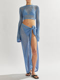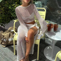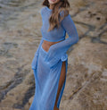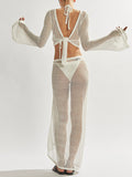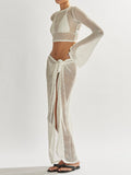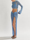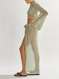 Embrace effortless beach style with this knitted crochet cover-up set for women. The two-piece outfit includes a sexy long sleeve hollow crop top paired with a split maxi skirt, creating a chic, bohemian-inspired look. Perfect for layering over your swimsuit, this breathable set offers both comfort and allure—ideal for beach days, poolside lounging, or seaside holidays. Elevate your swimwear collection with this stylish and versatile bathing suit cover-up ensemble.