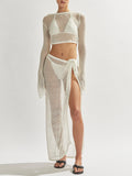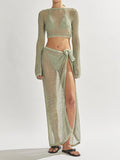 Knitted Crochet Beach Cover-Ups Swimsuit for Women Sexy Long Sleeve Hollow Crop Tops+Split Maxi Skirts Two Pieces Bathing Suit