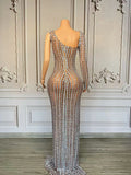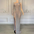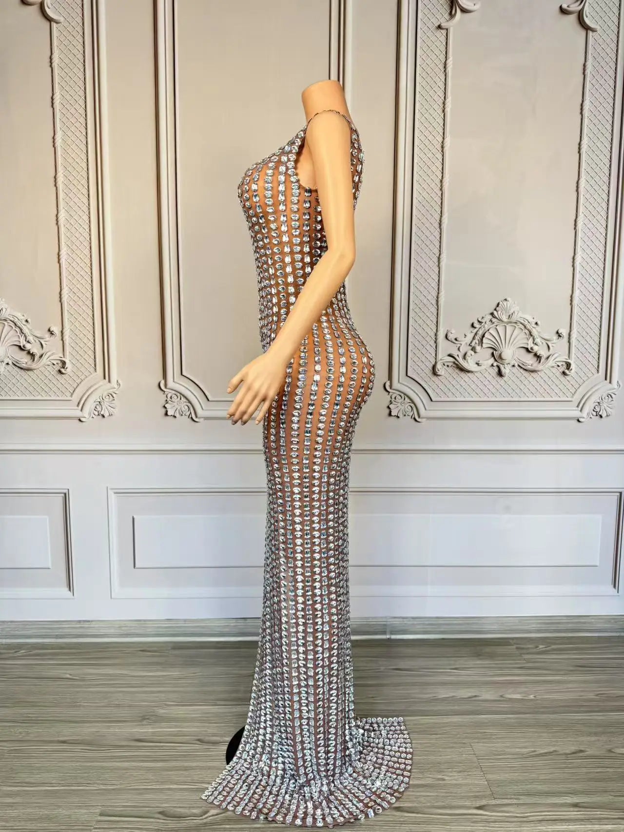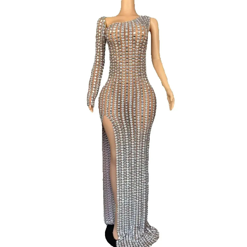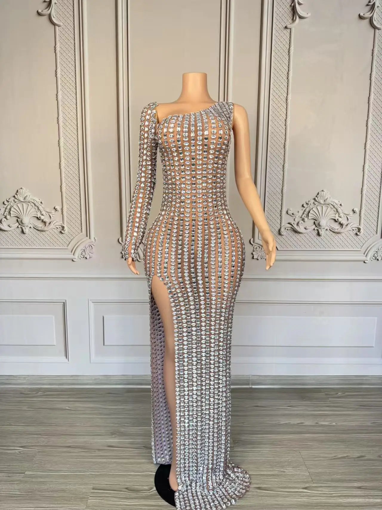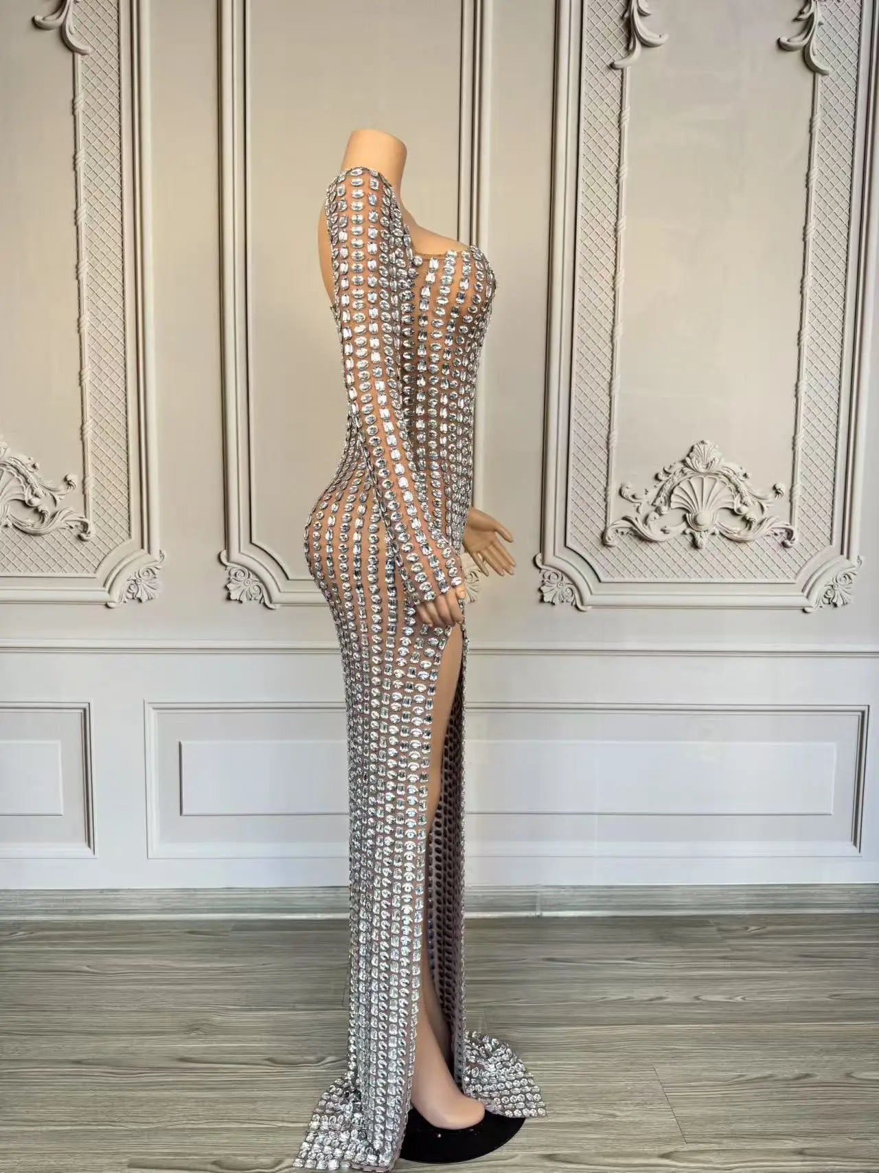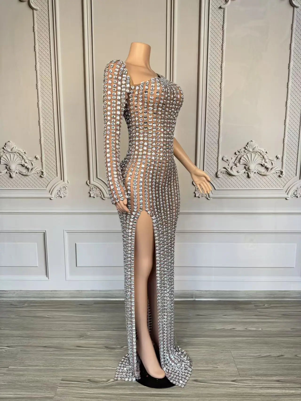 A couture-inspired, high-glam evening dress combining sheer mesh illusion, luxurious rhinestone coverage, and a dramatic high split—designed for singers, performers, birthday queens, and party-goers who want a bold, camera-ready statement on stage and in photos.