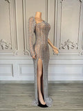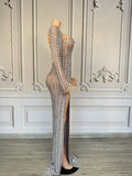 Luxurious Rhinestones Evening Party Birthday Celebrate Dress Women Sexy Mesh Transparent High Split Dress Singer Stage Wear