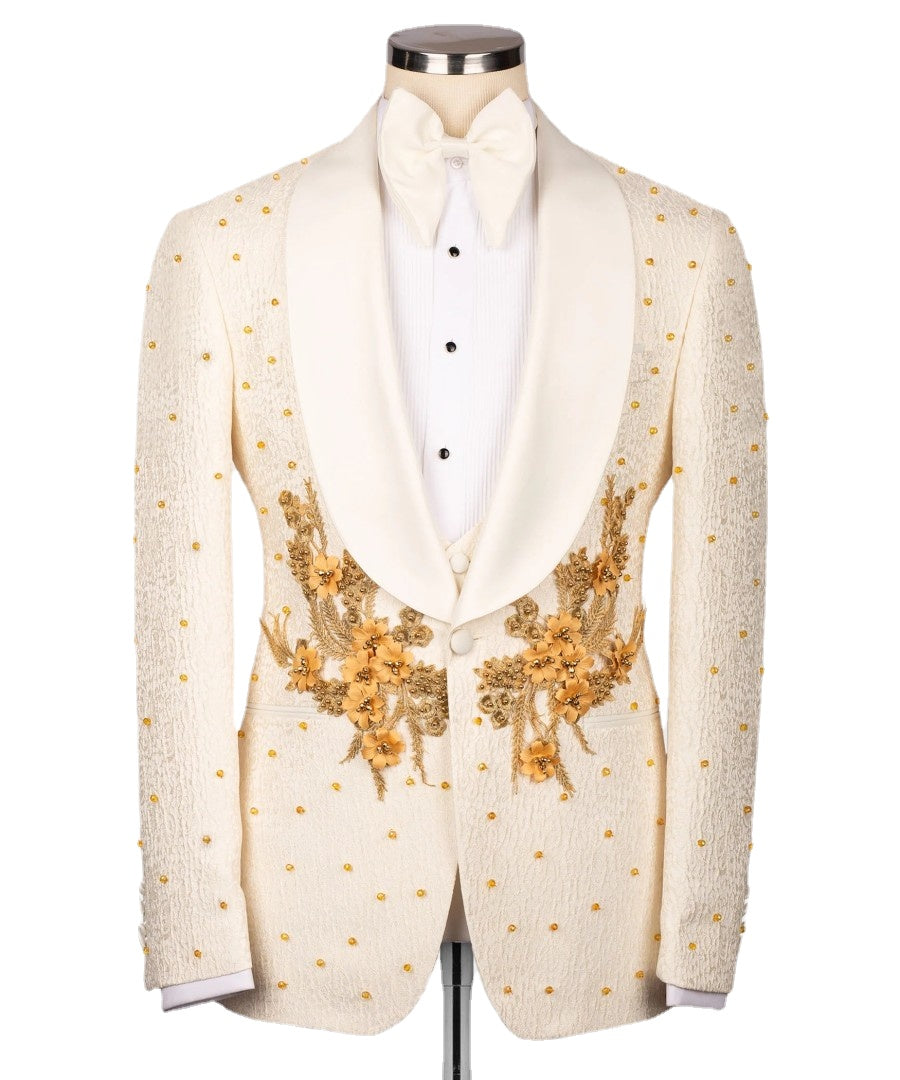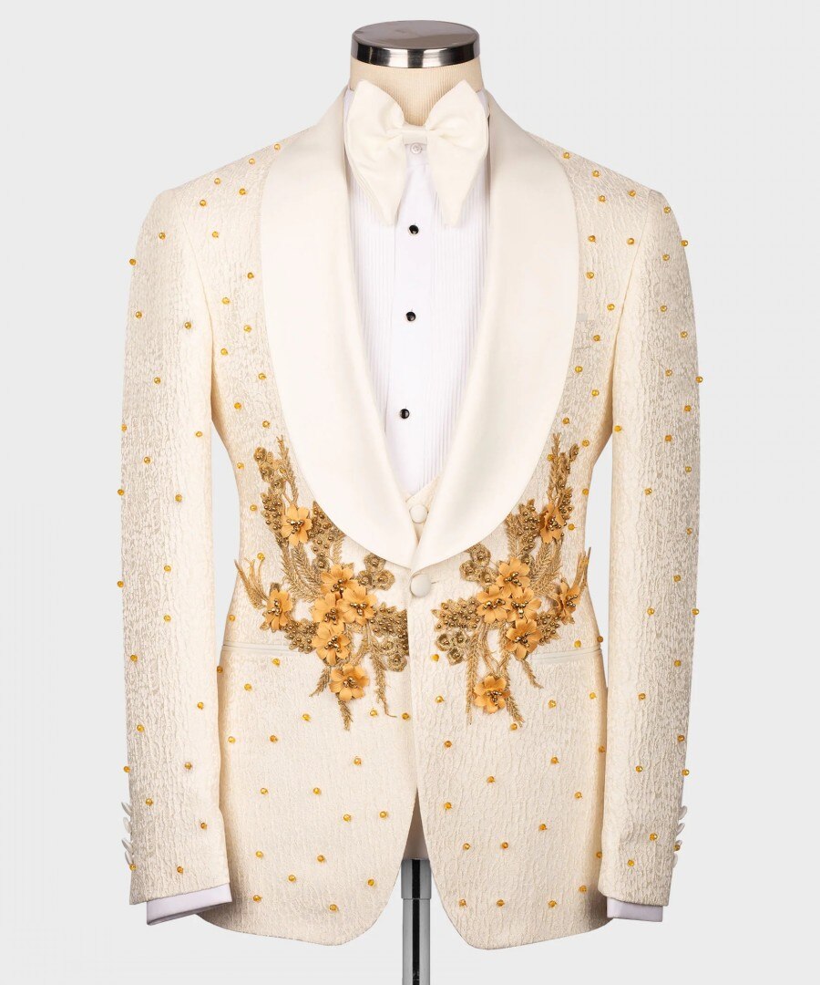 Costume de marié de luxe pour homme, smoking de mariage beige avec appliques de perles, sur mesure, 3 pièces, blazer, gilet, robe de soirée formelle