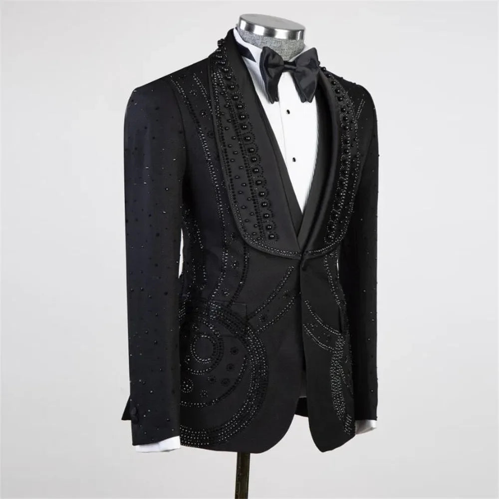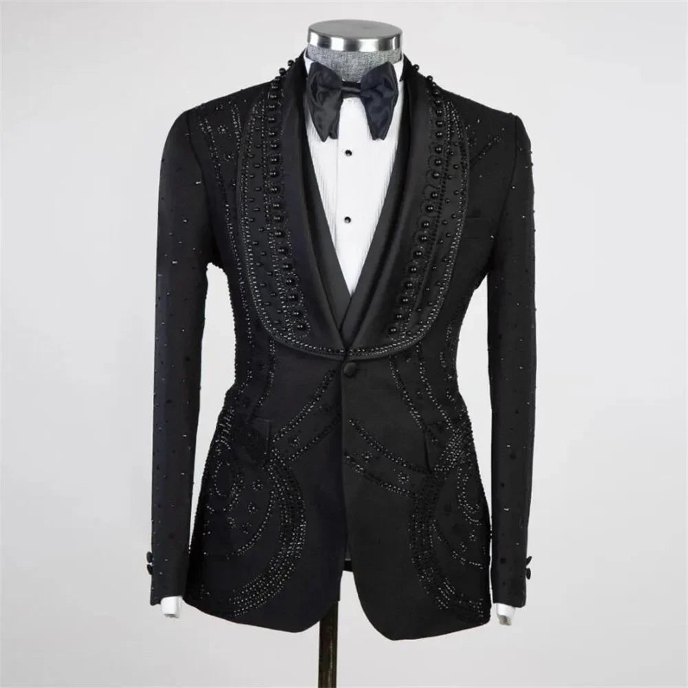 Men Suits Wedding Tailor-Made Pearls Beading Shawl Lapel 3 Pieces Set Coat One Button Groom Blazer Customized Jacket Vest Pants