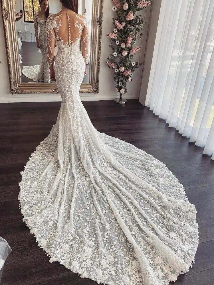 Superbe robe de mariée sirène avec tulle illusion, appliqués en dentelle et détails en perles – Robe de mariée élégante à manches longues pour une cérémonie de rêve