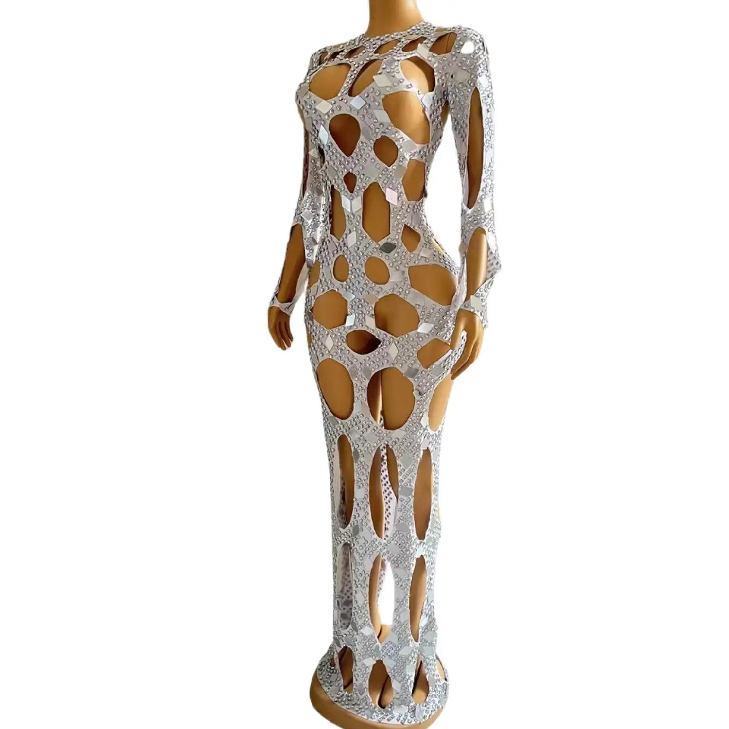 Sexy Flashing Silver Mirrors Rhinestones Cut-out Dress Birthday Prom Shining Outfit Evening Celebrate Prom Gala Gowns