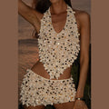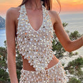 Affichez votre style estival avec cet ensemble jupe sexy en maille à sequins ajourés. Il se compose d'un haut dos nu sans manches et d'une mini-jupe trapèze, tous deux ornés de sequins scintillants et de détails tendance en maille ajourée. Idéal pour la plage, les fêtes ou les sorties estivales chics, cet ensemble allie élégance et audace pour un look glamour et accrocheur.