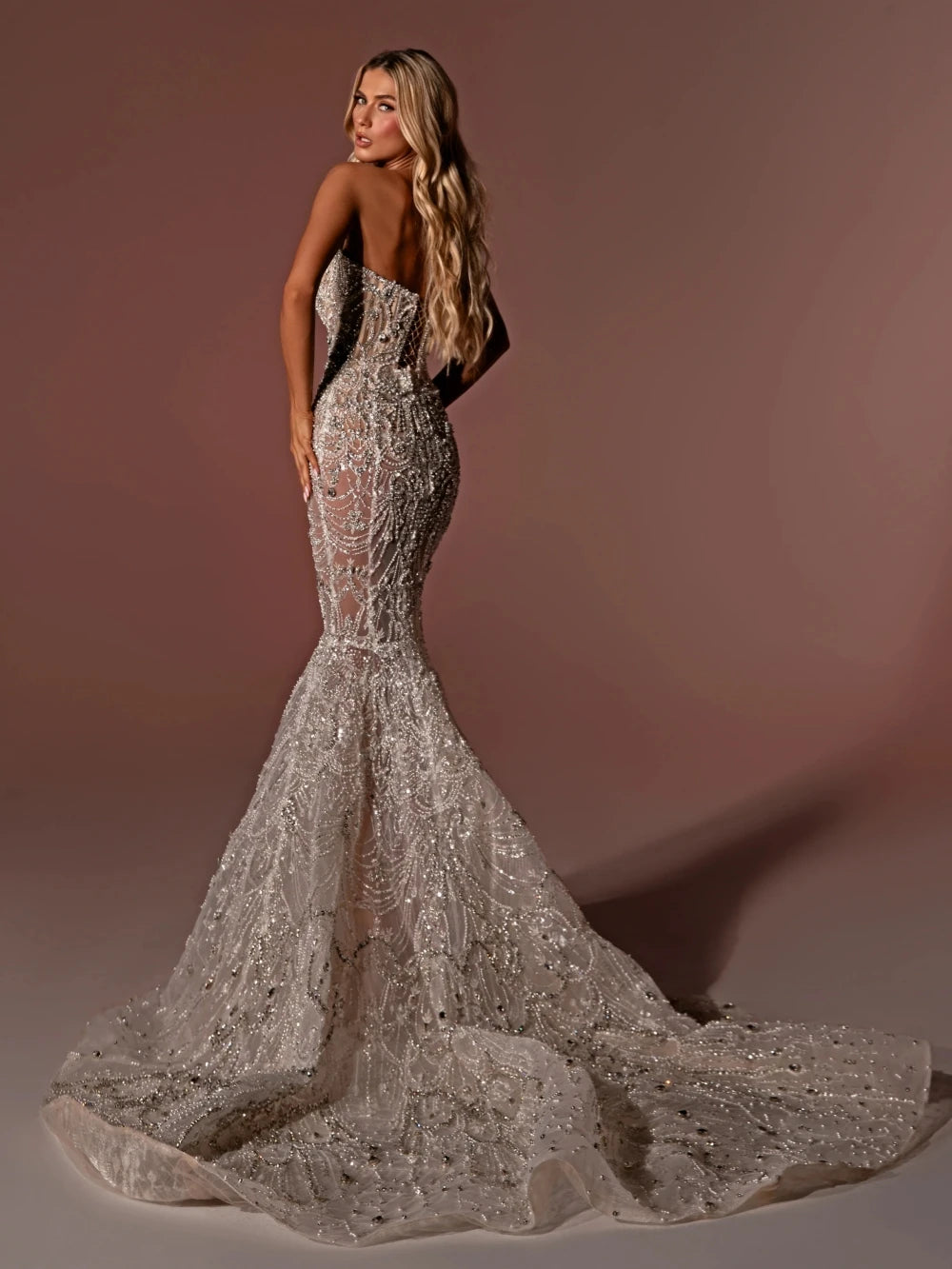 Faites une entrée éclatante pour votre grand jour avec cette luxueuse robe de mariée sirène, dotée d'un décolleté en V profond et illusion. Ornée de cristaux scintillants et d'élégants détails de perles, cette robe de mariée glamour est confectionnée sur mesure pour épouser parfaitement votre silhouette. Son éclat saisissant et son savoir-faire exquis vous garantissent un mariage resplendissant. Adoptez une élégance intemporelle et un romantisme moderne avec cette robe de mariée sophistiquée et personnalisée.