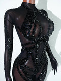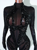 Body sexy en maille transparente noire avec strass pour chanteuse, danseuse, spectacle, tenue de scène, fête, boîte de nuit, performance