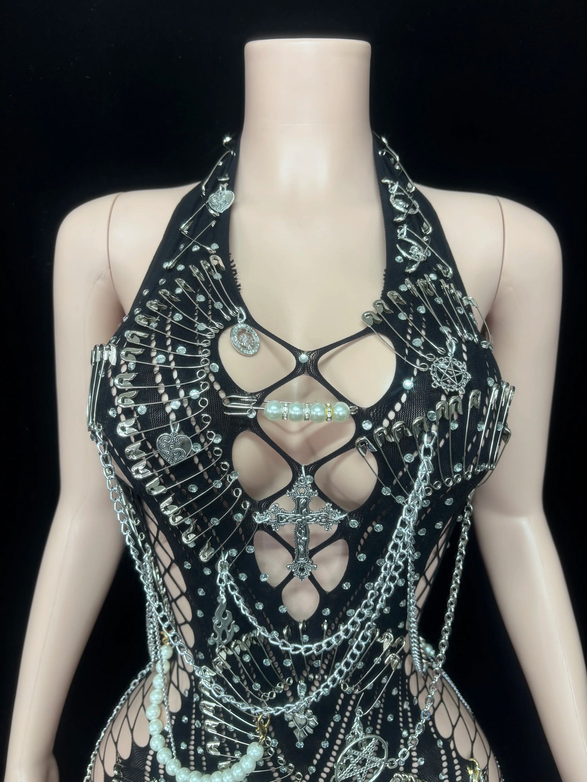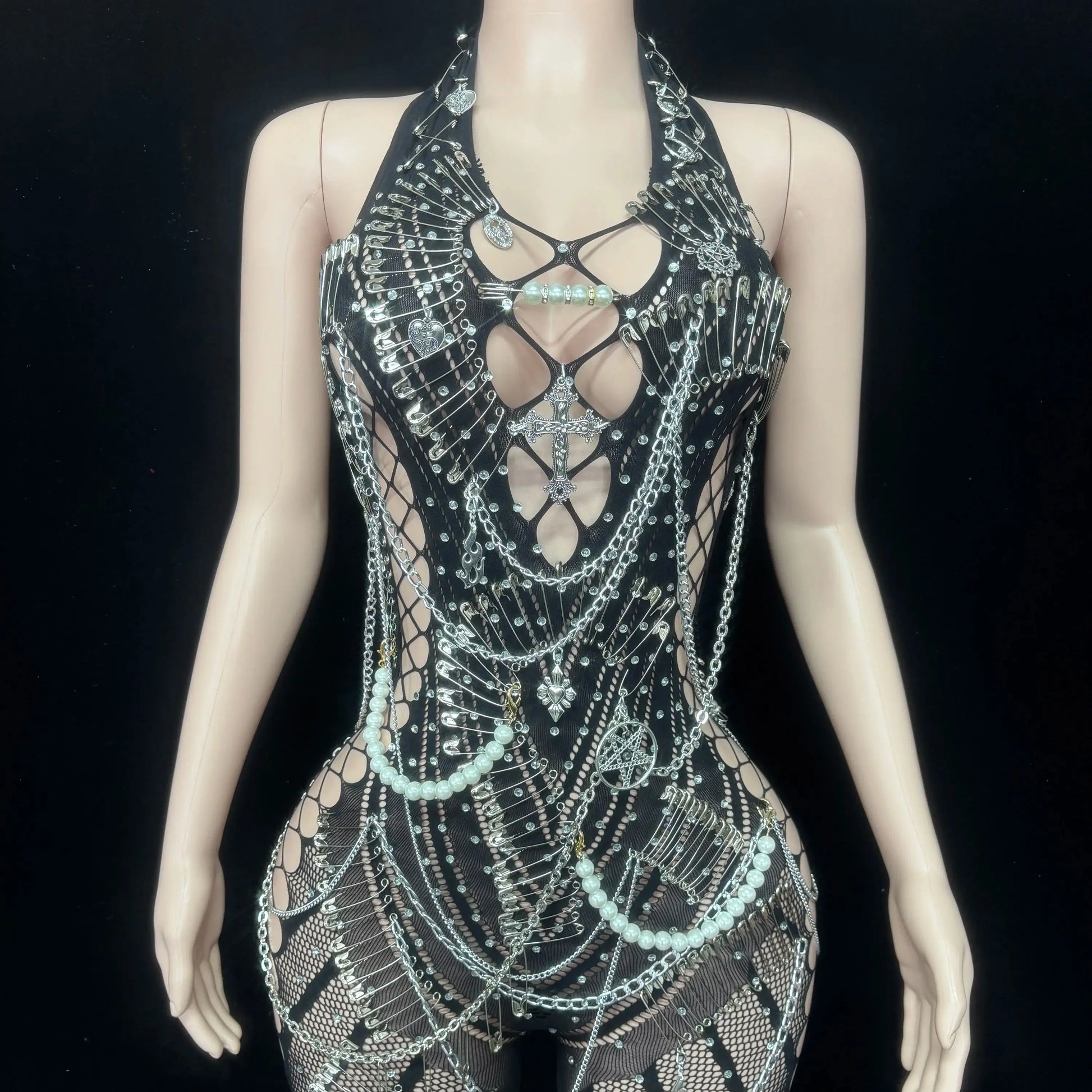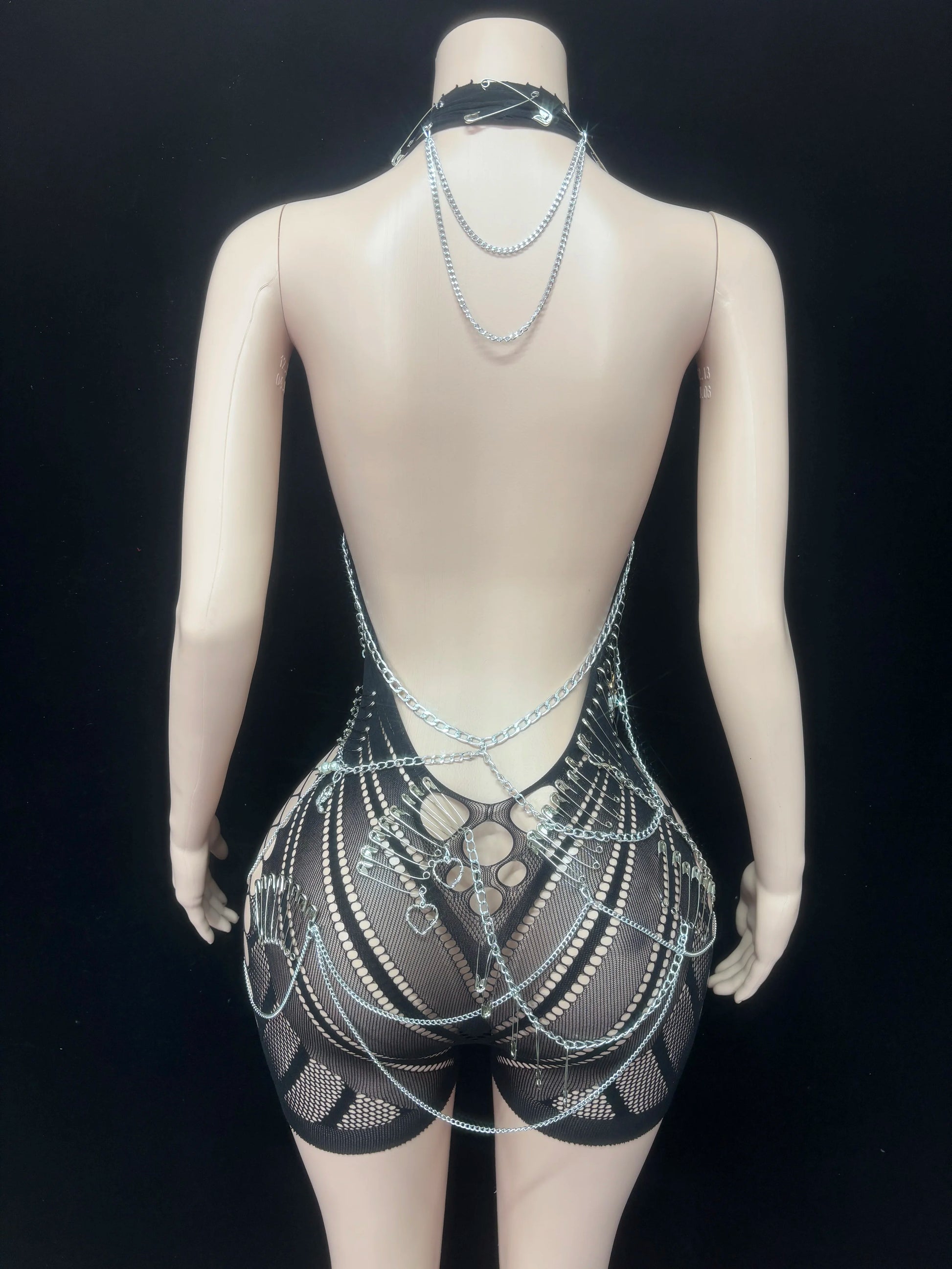 Faites tourner les têtes lors de votre prochain événement avec ce superbe body sans manches, doté d'un décolleté dos nu orné de chaînes de perles et de détails ajourés accrocheurs. Son dos nu ajoute une touche d'élégance supplémentaire, ce qui en fait le choix idéal pour les boîtes de nuit, les soirées ou les représentations sur scène. Conçu pour les femmes sûres d'elles qui aiment se démarquer, ce nouveau body allie élégance sexy et style époustouflant.
