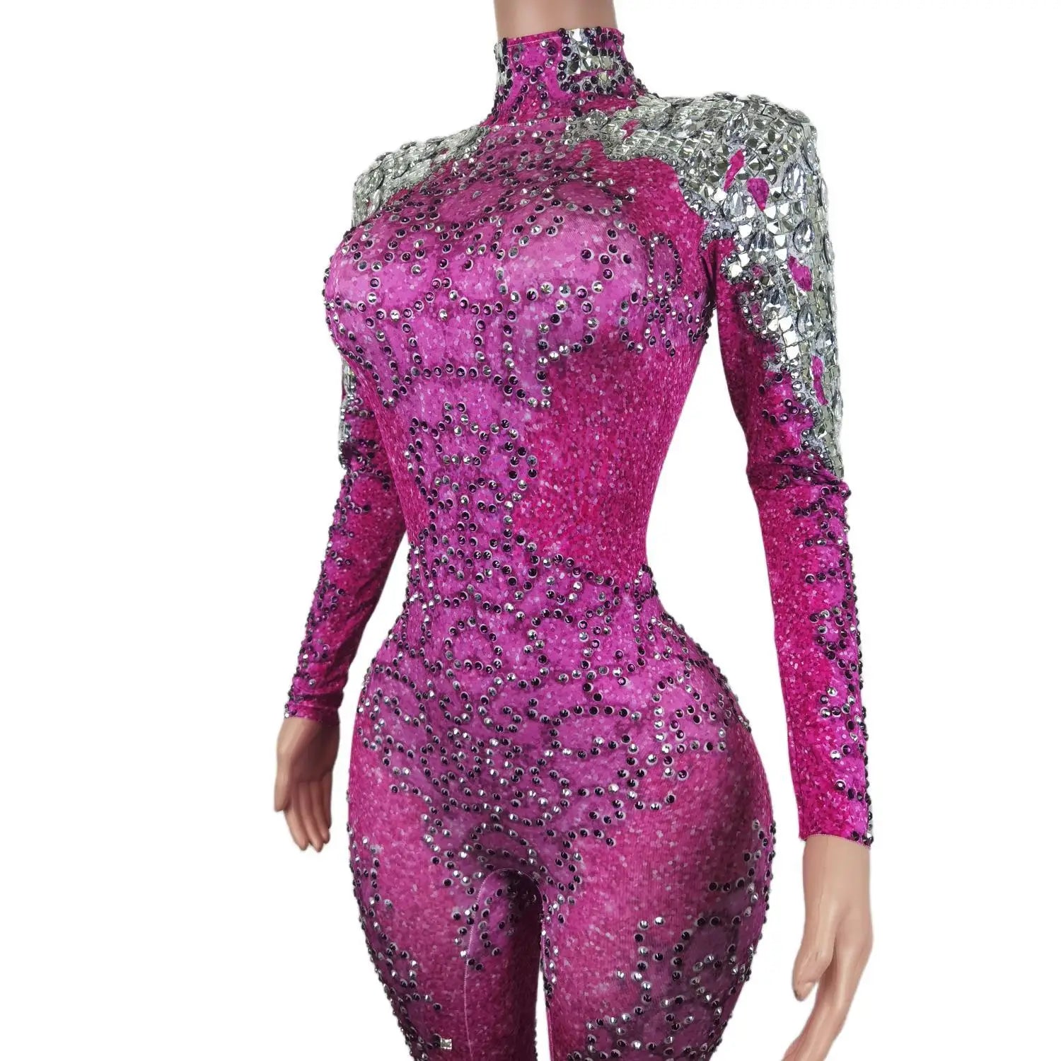 Sexy Pink High Necked and Backless One Piece Bodysuit Women Shining Rhinestone Performance Costumes Party Prom Bodycon Jumpsuits