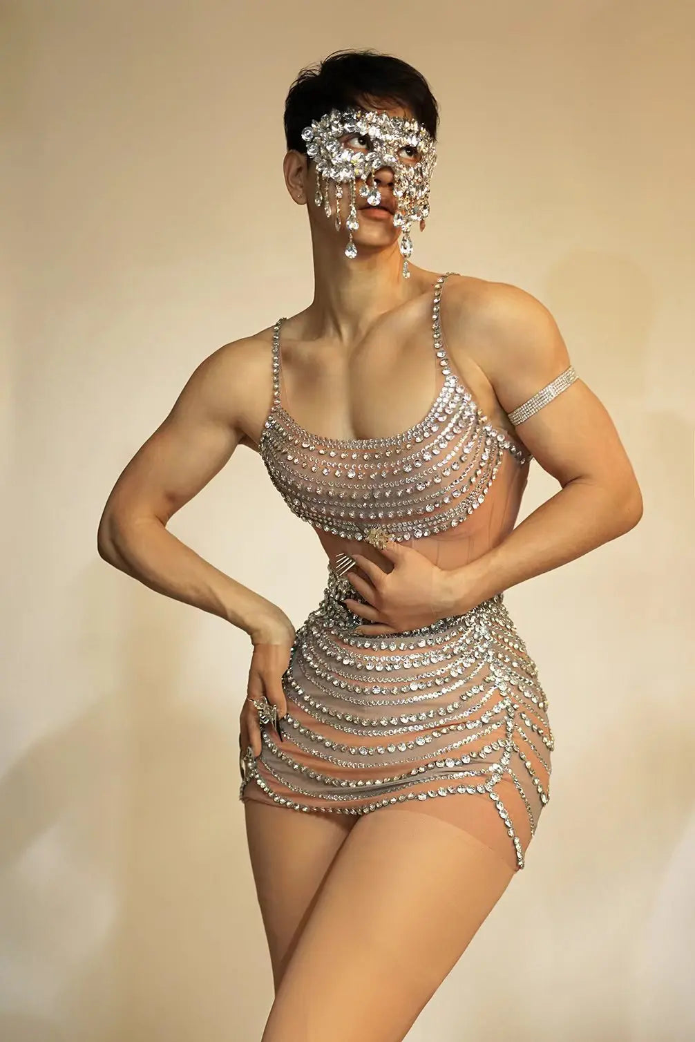 Robe de pole dance sexy avec strass scintillants, sans manches, tenue de soirée, d'anniversaire, de bal, de fête, Fanwan
