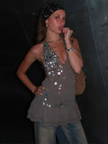 Brillez toute la nuit dans cette robe courte sexy à sequins pour femme, dotée d'un décolleté dos nu lacé, d'une coupe sans manches et d'un dos nu séduisant. Son ourlet à volants fantaisie et sa coupe trapèze flatteuse créent un look chic et féminin, parfait pour les soirées, les sorties ou les occasions spéciales du printemps et de l'été. Soyez sous le feu des projecteurs et exprimez votre style unique avec cette robe saisissante.
