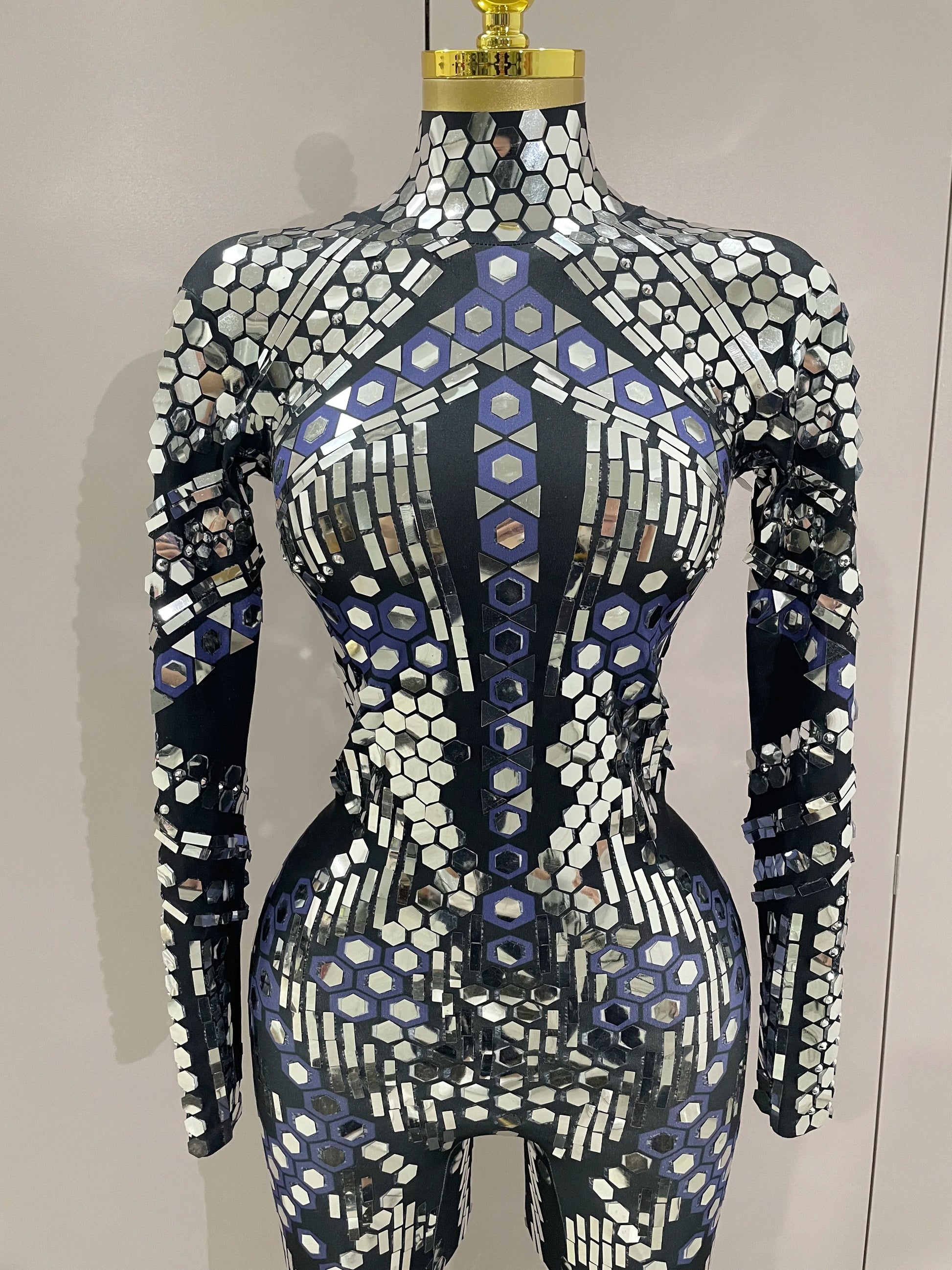 Make a bold entrance in this sexy shiny silver sequin and mirror jumpsuit, designed with sleek black spandex for a perfect body-hugging fit. The dazzling reflective details ensure you sparkle from every angle, making it the ultimate choice for prom, evening parties, birthday celebrations, singers, dancers, or unforgettable stage performances. Step into the spotlight and own every moment in this show-stopping stage outfit!