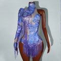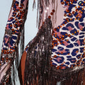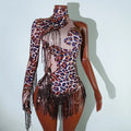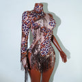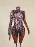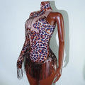 Sexy Skinny Leotard Singer Dancer Show Stage Wear Sparkly Leopard Rhinestones Women Dance Costume Fringes One Shoulder Bodysuit
