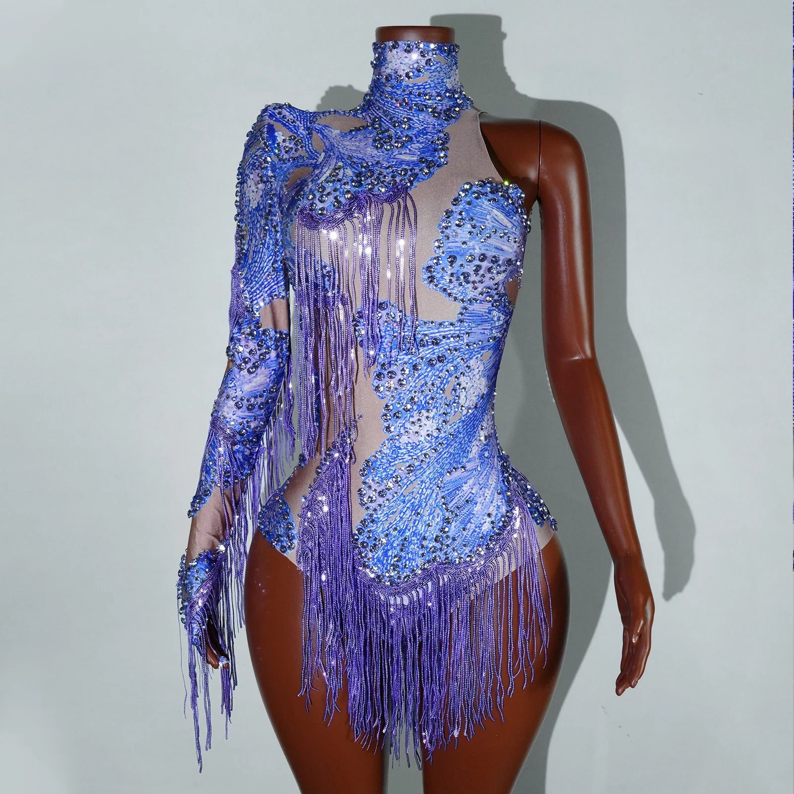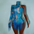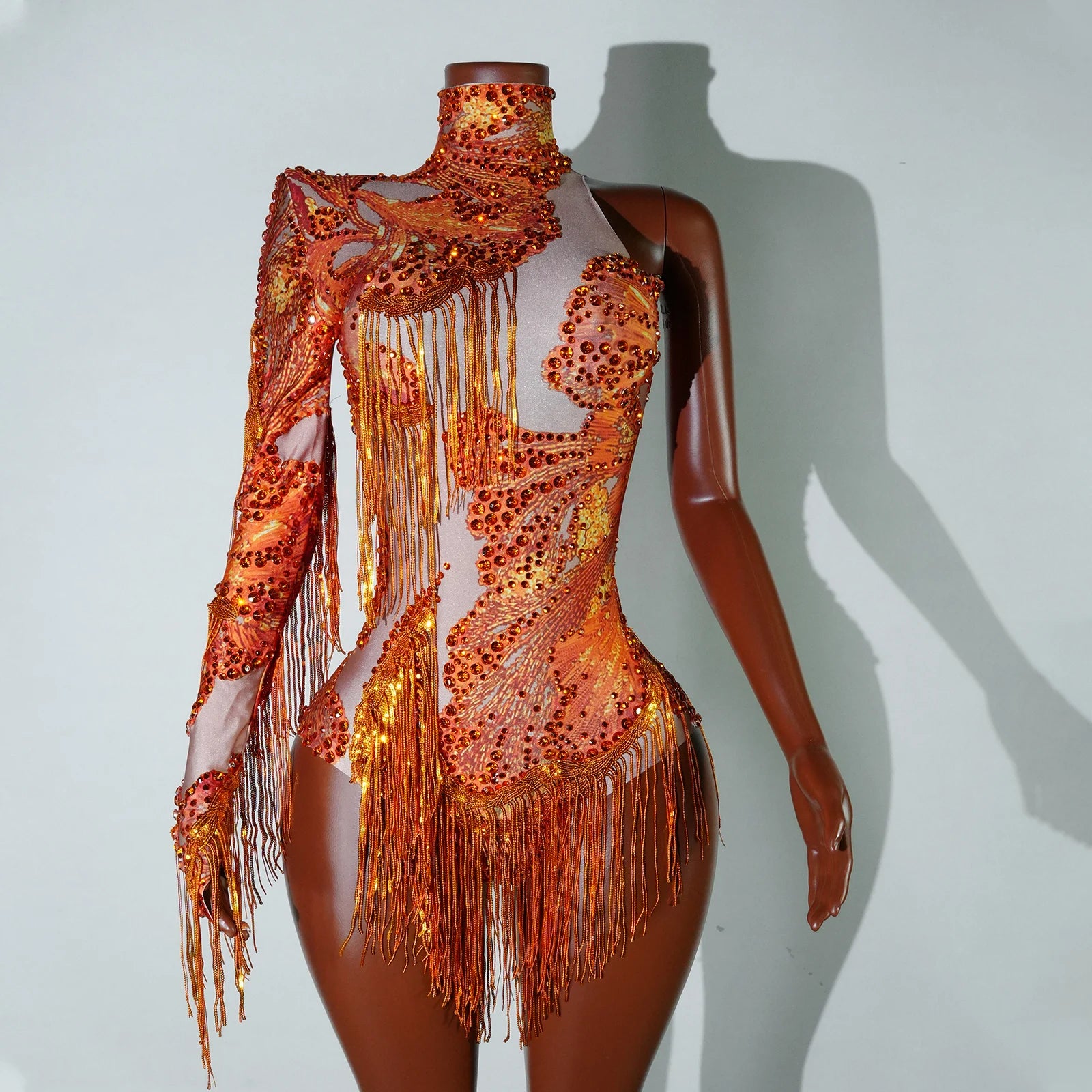 Unleash your inner diva with this sexy skinny leotard, designed to dazzle under the spotlight. Featuring a fierce sparkly leopard print adorned with glimmering rhinestones, this one-shoulder bodysuit is finished with playful fringe accents for extra movement and flair. Perfect for singers, dancers, and performers, this unique stage wear ensures all eyes will be on you at any show, party, or high-energy dance performance.