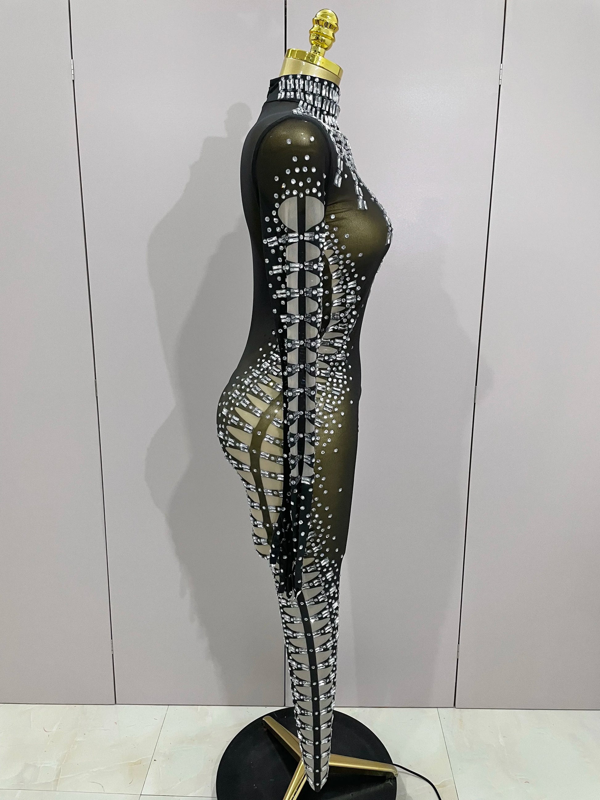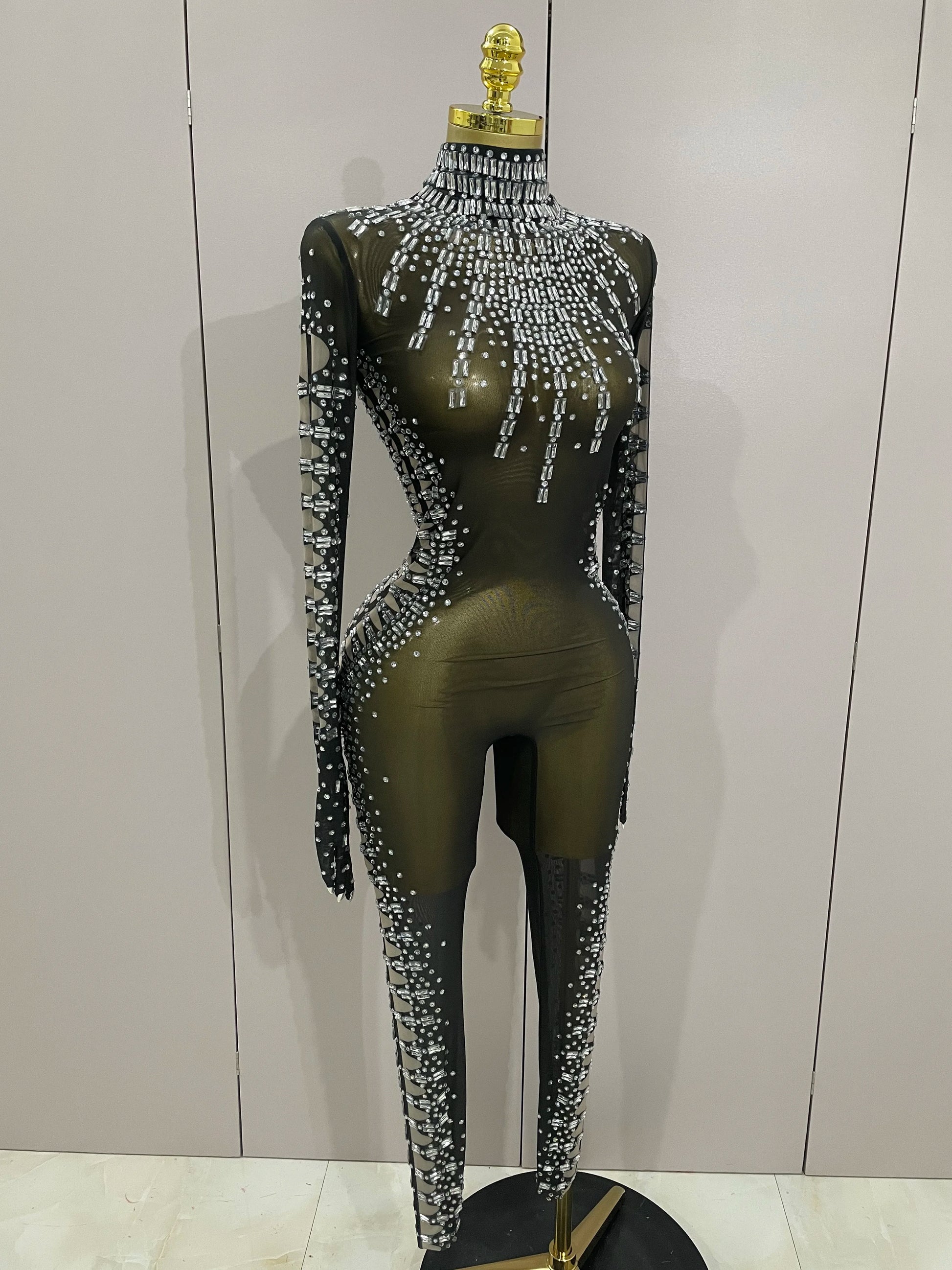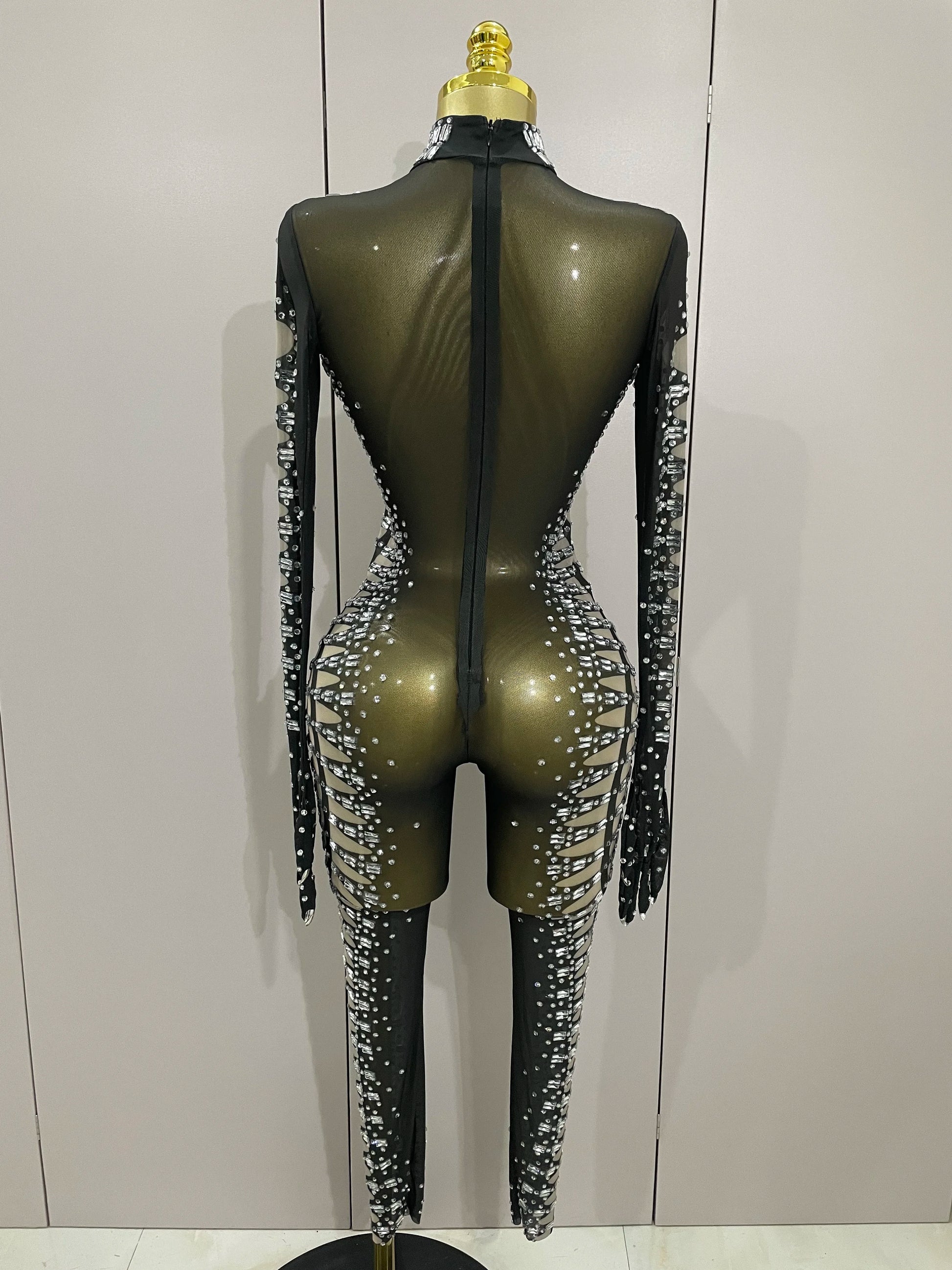 Soyez sous les projecteurs avec cette combinaison sexy en résille noire scintillante, ornée de cristaux scintillants pour un look inoubliable. Ce costume audacieux pour femme, accompagné de gants assortis, est idéal pour les anniversaires, les soirées en boîte de nuit ou pour dominer la scène en tant que chanteuse ou danseuse. Sa coupe ajustée et ses détails en résille transparente créent une silhouette sensuelle, tandis que les cristaux scintillants captent la lumière. Rendez votre prochain événement mémorable avec cette tenue de spectacle époustouflante, conçue pour celles qui aiment se démarquer.