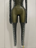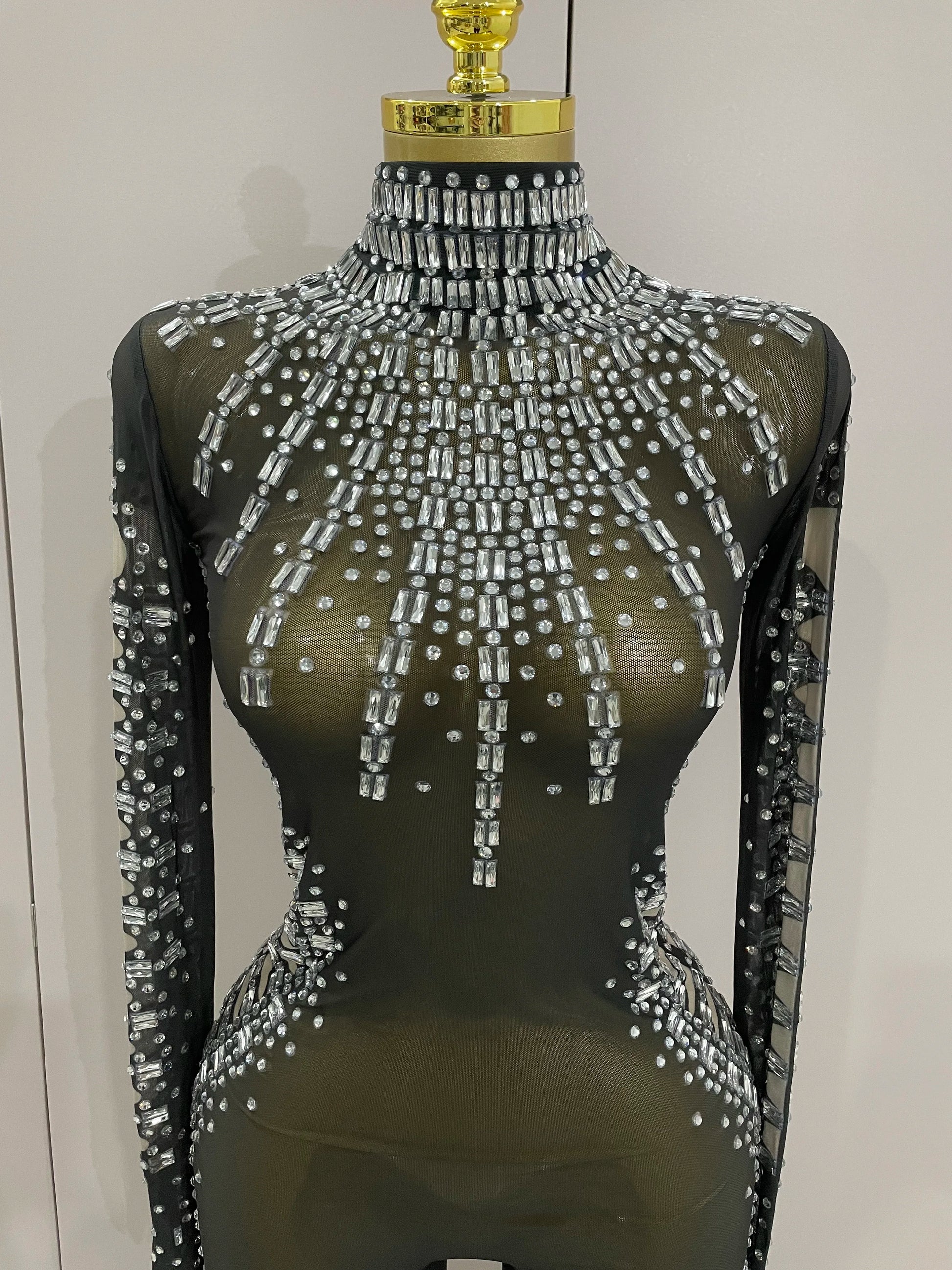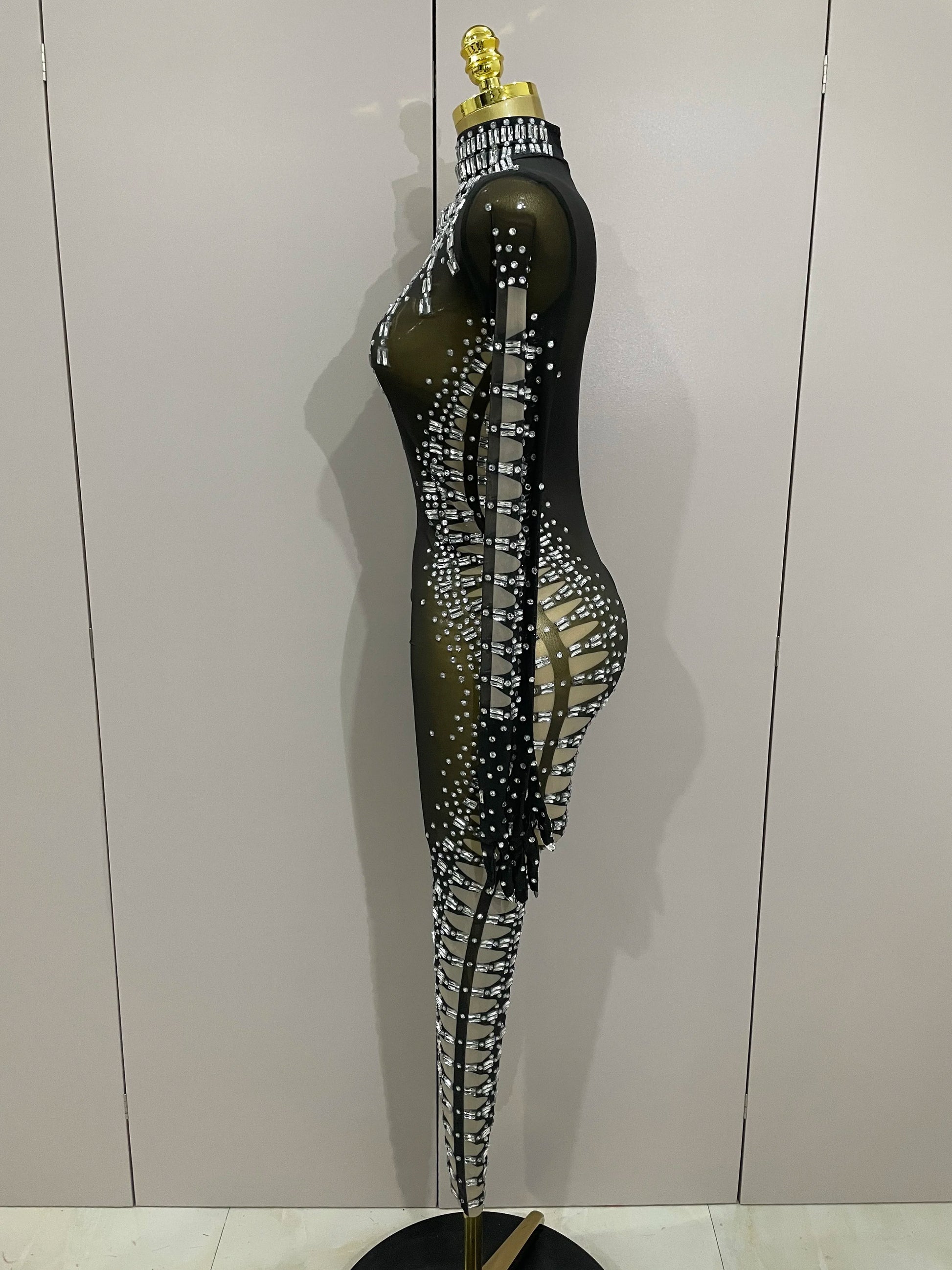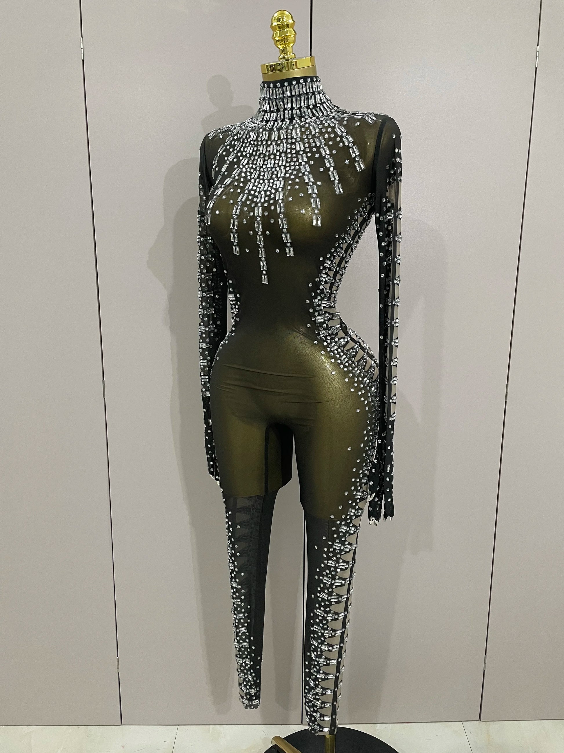 Soyez sous les projecteurs avec cette combinaison sexy en résille noire scintillante, ornée de cristaux scintillants pour un look inoubliable. Ce costume audacieux pour femme, accompagné de gants assortis, est idéal pour les anniversaires, les soirées en boîte de nuit ou pour dominer la scène en tant que chanteuse ou danseuse. Sa coupe ajustée et ses détails en résille transparente créent une silhouette sensuelle, tandis que les cristaux scintillants captent la lumière. Rendez votre prochain événement mémorable avec cette tenue de spectacle époustouflante, conçue pour celles qui aiment se démarquer.